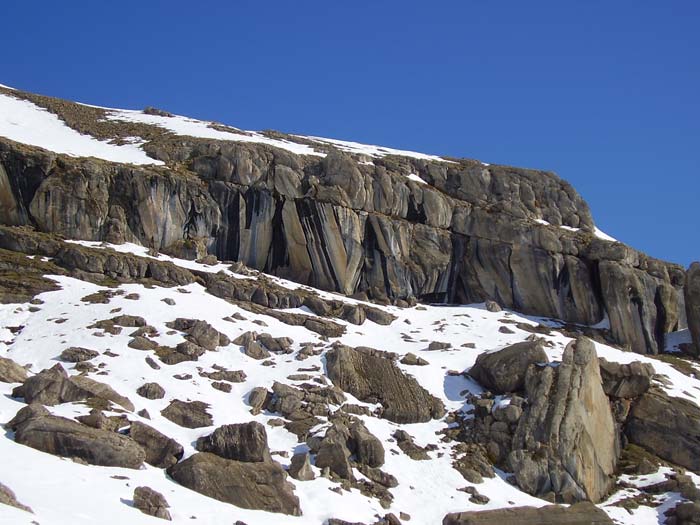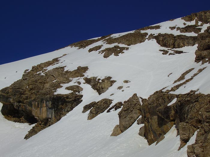 Le seul risque perçu concerne l'écharpe suivie entre 2590 et 2640 environ entre deux barres. Des fissures et de la neige molle profonde apparaissent sous les rochers de la barre supérieure. On pouvait craindre une reptation du manteau, vu la chaleur et l'heure, environ 10h30. A part ça, mais cela avait déjà été signalé, on voit très bien les cassures de plaques sous la pointe sud de la Vénasque et le pic du Clot l'Amiande qui ont garni Planure.