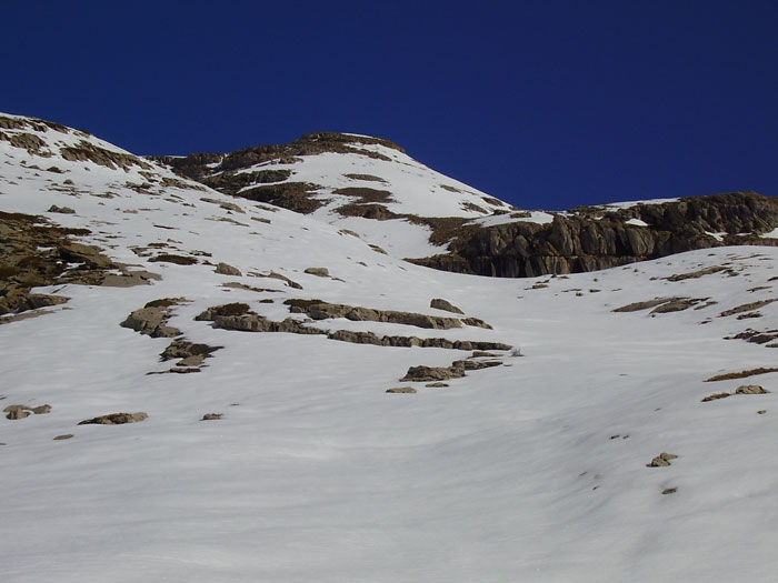 A 2350m sur l'itinéraire des Moutières, constatant que ça ne passait pas, nous avons choisi un passage plus haut, vers 2550, qui nous a conduits vers une petite pente et une écharpe droite-gauche pour passer entre deux barres. Ensuite, montée directe au sommet. À la descente, j'ai tenté de contourner ces barres par la gauche (sud), mais j'ai dû déchausser entre 2600 et 2550 (passage facile dans des rochers délités), puis regagner en traversée l'itinéraire de montée.
