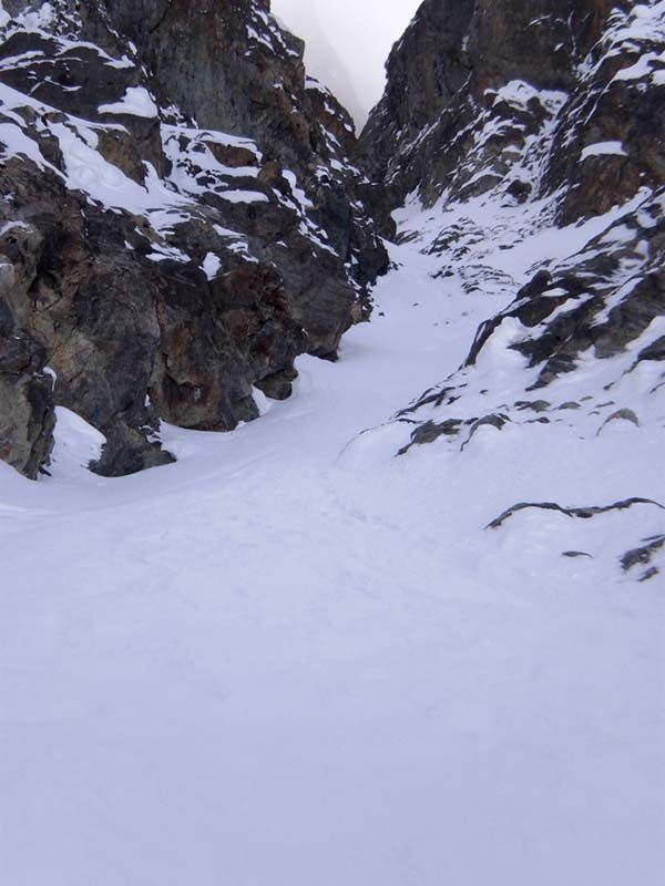 Casset-Col d'Arsine puis traversée du chaos en prenant trop à droite, à cause du manque de visibilité, en suivant des traces qui allaient vers la Plate des Agneaux. Du coup, traversée à gauche vers 2700 pour visiter deux couloirs avant de trouver le bon (il aurait suffi que je sorte la carte !) : celui qui monte vers le col du glacier Blanc (plus une grande pente qu'un couloir, très large au début avec des séracs à droite), puis celui qui monte au col du glacier d'Arsine, beaucoup plus étroit et barré par une rimaye infranchissable tout seul et sans matos.