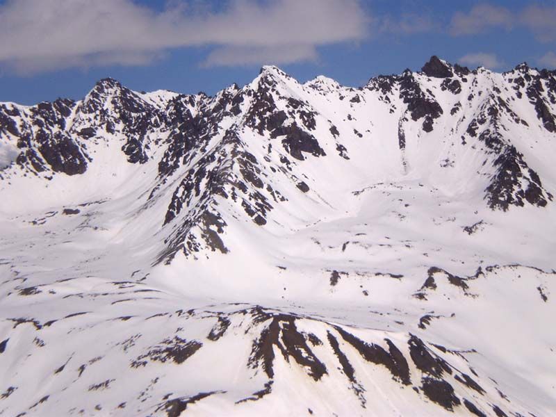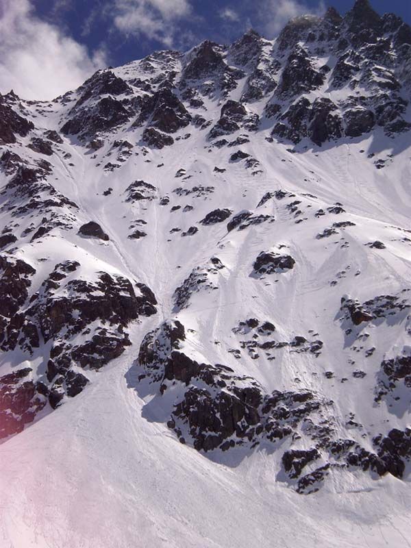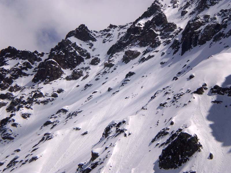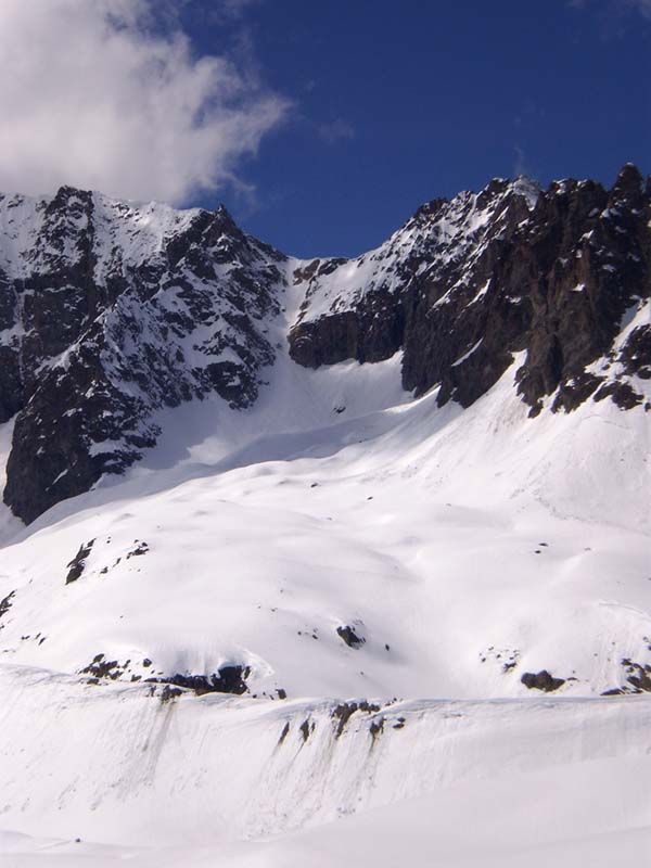 nombreuses purges dans les pentes chaudes, mais pas seulement. Des plaques importantes se sont décrochées dans les pentes nord sous 2200 environ, notamment en bas du petit Davin. Le micro est complètement ravagé. Grosses avalanches descendues du versant nord de la pointe du Réou d'Arsine jusqu'au lac de la Douche, sans doute il y a une semaine. Beaucoup de coulées dangereuses venant des crêtes morainiques dans la traversée du chaos, gaffe ! surtout que la neige est encore bien pourrie... Dans les couloirs, pour ce que j'ai pu en voir, ça va beaucoup mieux au-dessus de 2800, mais il y a toujours de belles corniches prêtes à se vautrer.