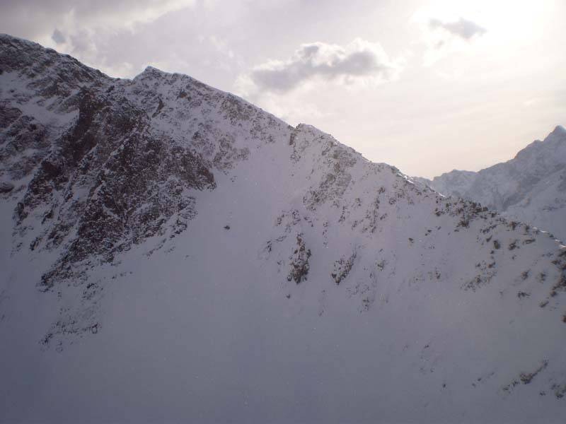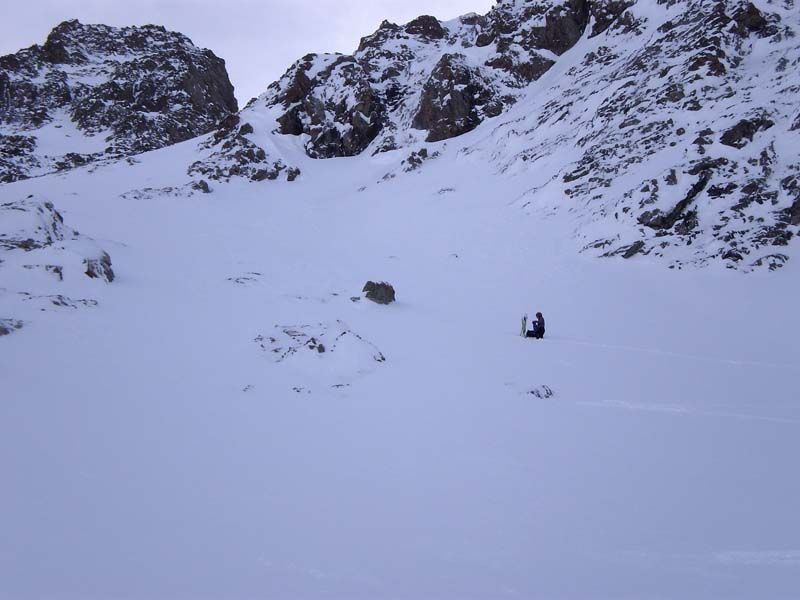 Nous étions tentés par la variante A3.2 pour monter au pic Ouest de Combeynot, mais nous avons dû rebrousser chemin vers 2600 dans le goulet NO qui permet de surmonter le premier système de barres : de belles plaques friables de 30 cm d'épaisseur partaient sans aucun effort. La combe au-dessus aurait sans douté été plus fréquentable, mais nous n'aurions pas pu sortir en haut. Des décrochements de petites plaques friables dans le vallon de Laurichard formées par un travail du vent. En haut de la pente sud vers la Pyramide, la neige un peu alourdie a tendance à partir en coulées.