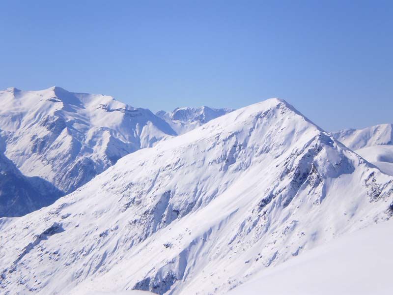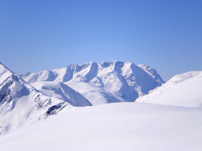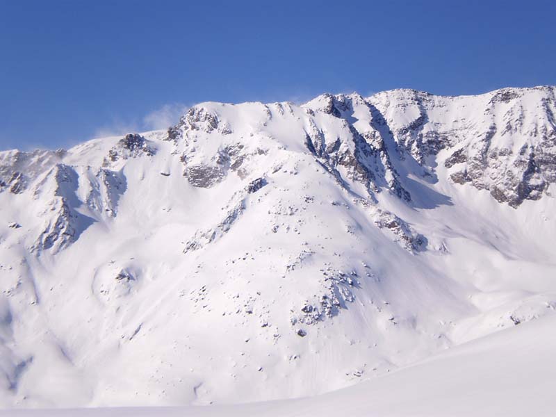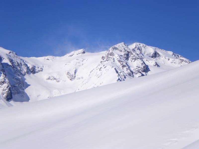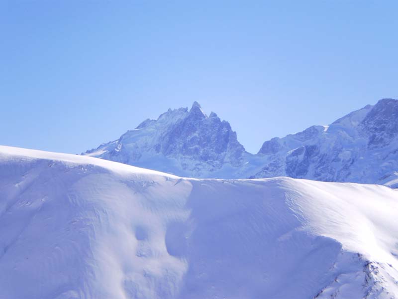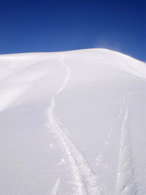 Entre la montée vers 11 h et la descente vers 13 h, la neige a évolué, de poudreuse légère à poudreuse-grains fins légèrement liés sous l'action du vent, absent quand je montais en-dessous de 2100 (la première bosse) et bien présent à la descente. Le soleil a participé à la transformation en humidifiant un peu la neige, ce qui fait qu'elle fut bonne à skier, mais pas excellente comme je l'anticipais... sauf en haut juste sous le sommet où elle est restée froide.