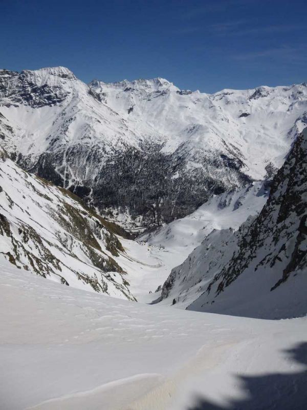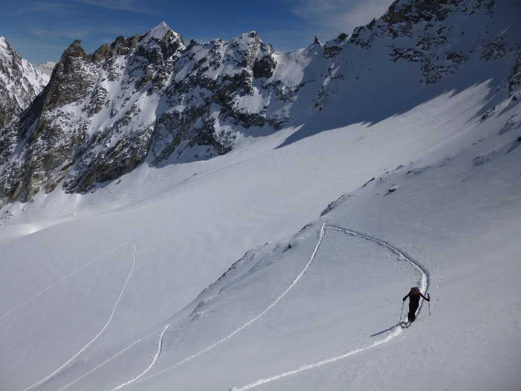 Je me suis arrêté 100m sous le sommet. Le dernier bombé de la pente finale ne m'a pas semblé très sain. Sinon, très belles conditions de ski jusqu'en bas malgré le réchauffement dans l'après midi. Seuls dans le secteur et contrairement à ce que je craignais après les chutes de neige d'hier, très peu d'hélicos (deux déposes seulement en face sur Ormelune). En rentrant à Chamonix, un rapide coup de jumelles m'a permis de voir des traces sous le Grand Plateau (nombreuses), deux à trois dans le Mallory, une demi douzaine dans la face nord du col du Plan, deux à trois sous le Spencer.