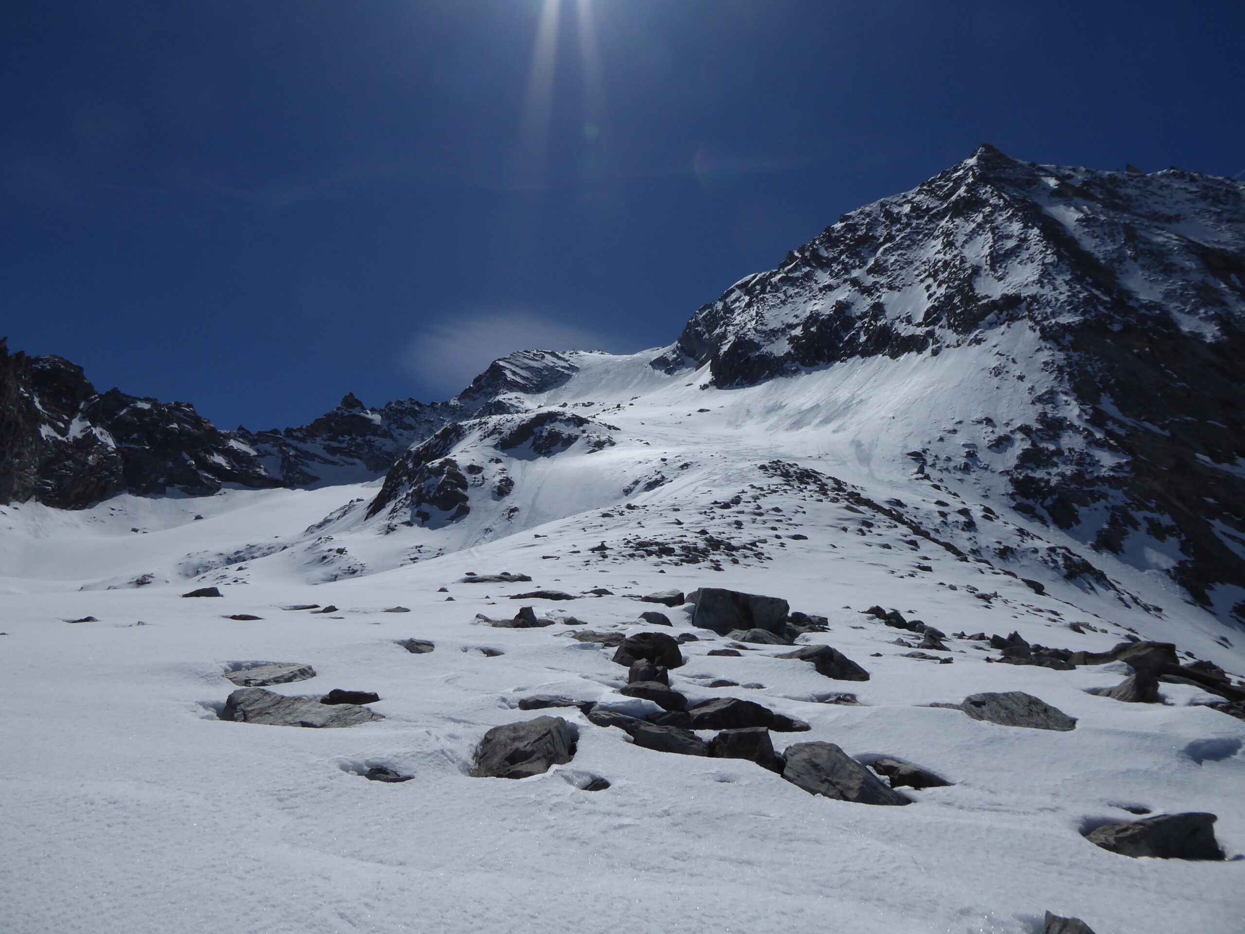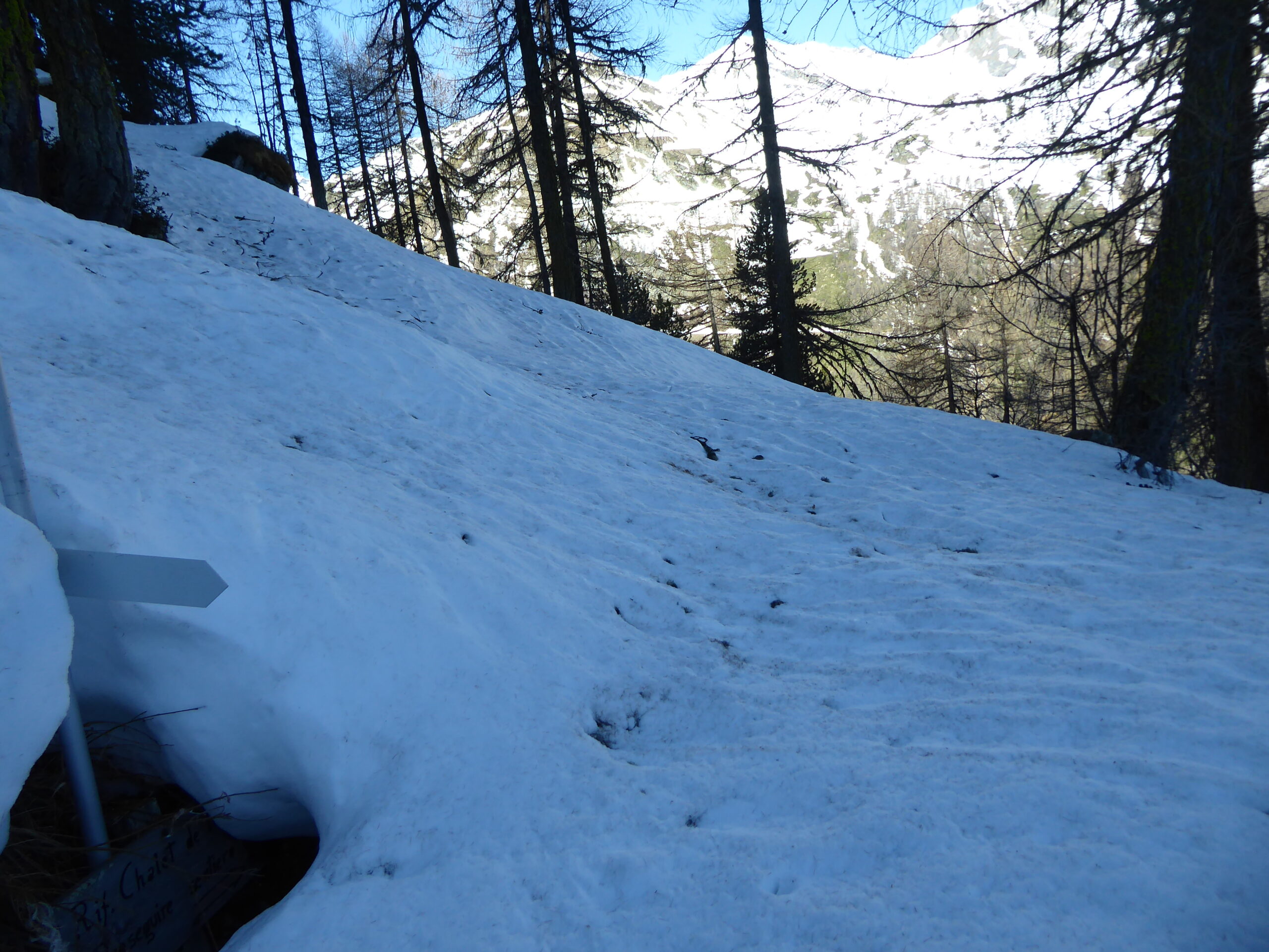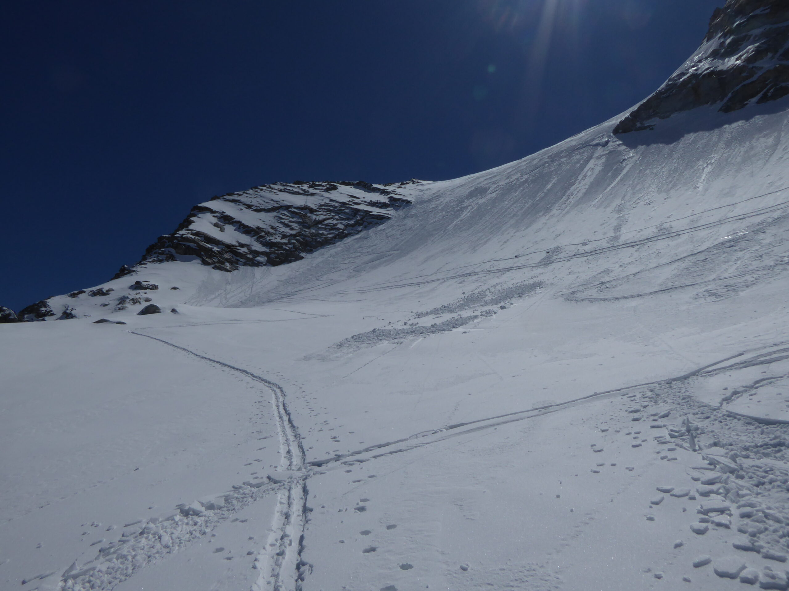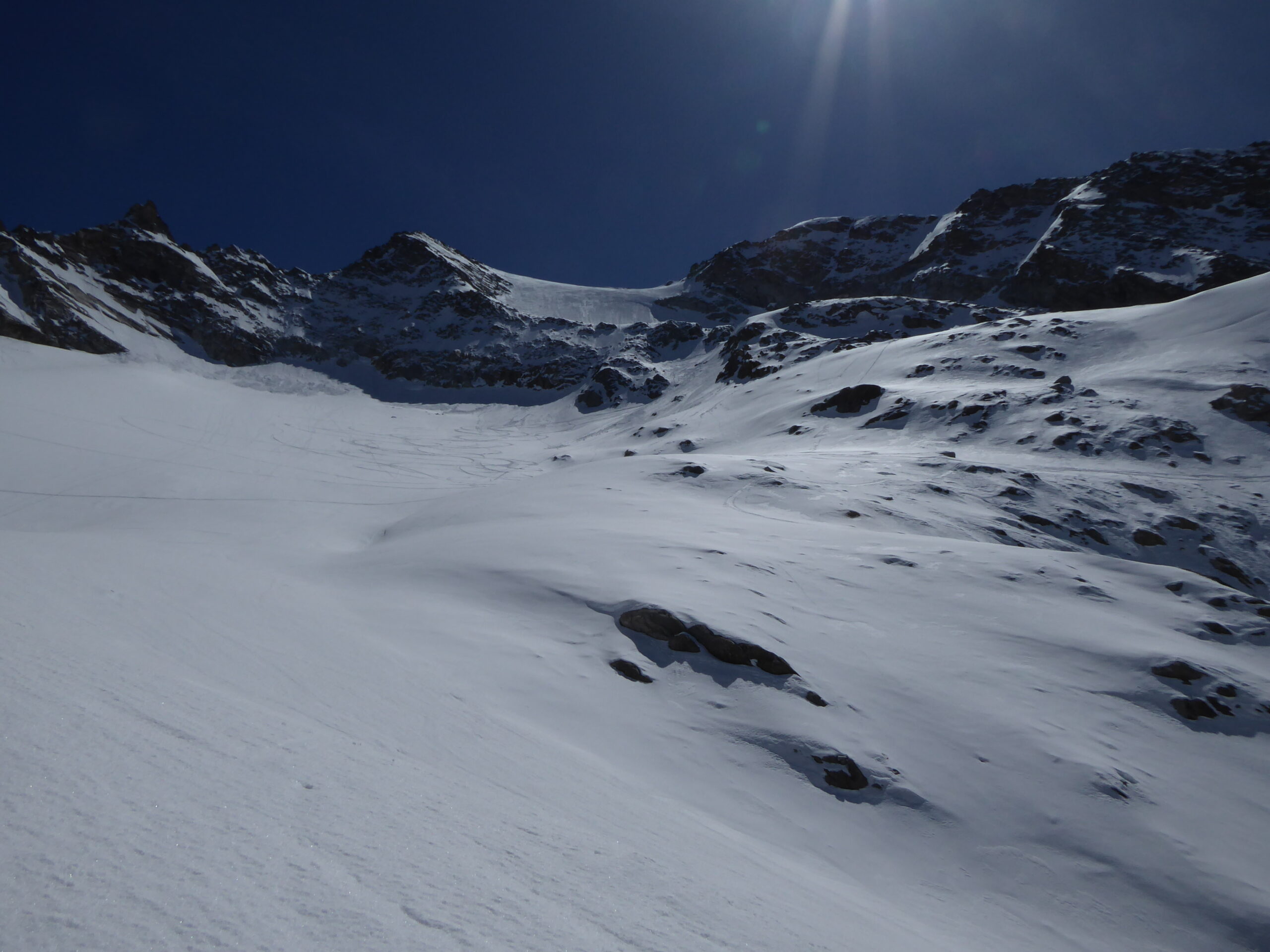 Neige transformée jusque 3000. Au-dessus, 5 à 10 cm de poudreuse ventée sur un fond dur un peu irrégulier. Pas de signe d'instabilité.