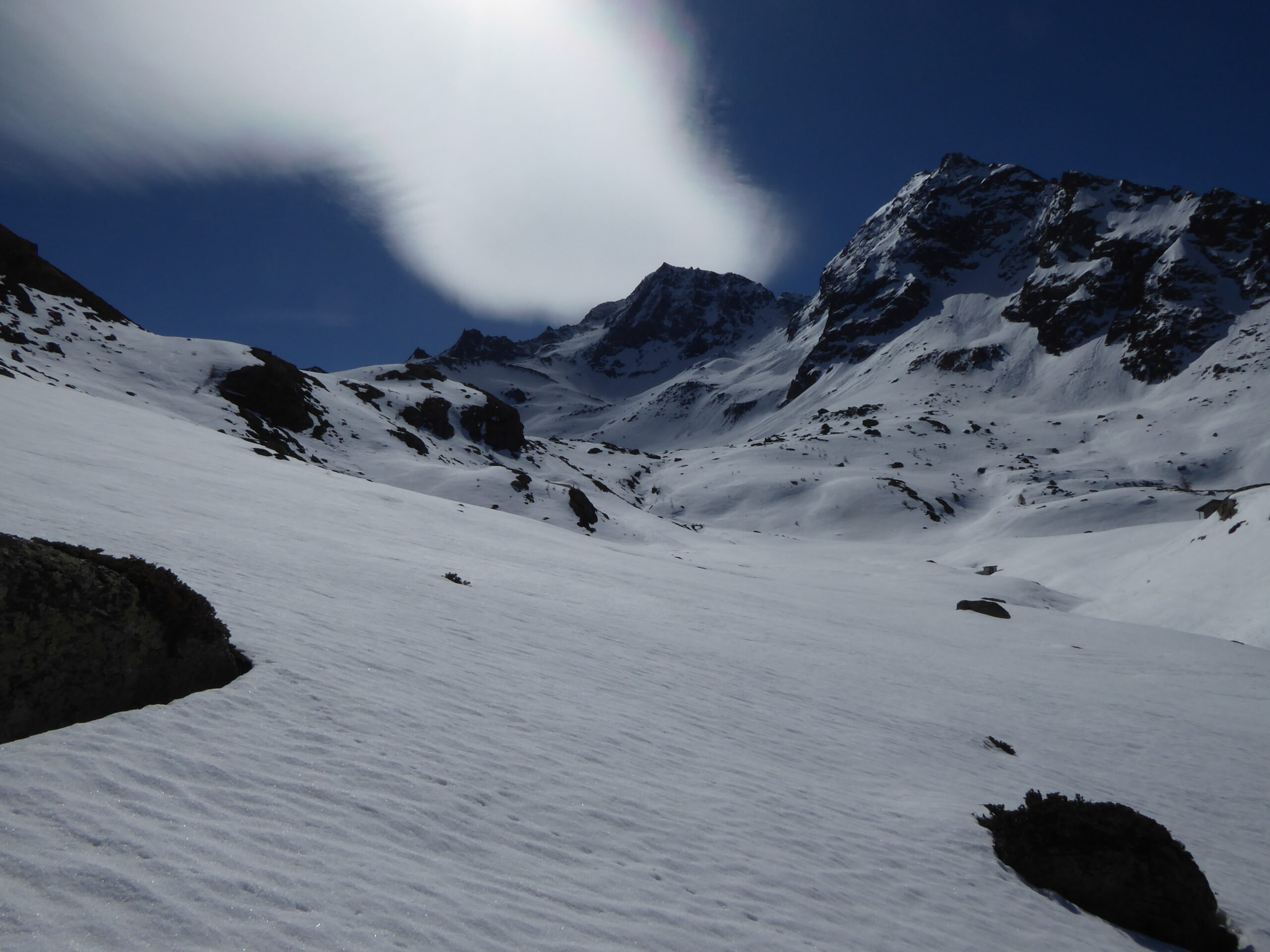 La route en rive gauche du barrage n'est pas encore dégagée. Celle en rive droite n'est plus assez enneigée pour permettre de chausser. J'ai porté jusque 1900 sur cette route puis sur celle qui mène à Rocher. J'ai ensuite suivi l'itinéraire en forêt qui mène au chalet de l'Epée. Celui-ci est fermé. La piste carrossable sous la route rive droite est dégagée et permet de rejoindre Usellières. La pente finale de la pointe Rabuigne présente une section de 50 à 100 m proche de 40°. Il y a 10 ans, je m'étais arrêté 100 m sous le sommet, la dernière pente ne m'ayant pas paru assez stable : https://www.volopress.net/sortie/rabuigne-col-fenetre-par-le-vallon-du-bouc-14-04-2016/