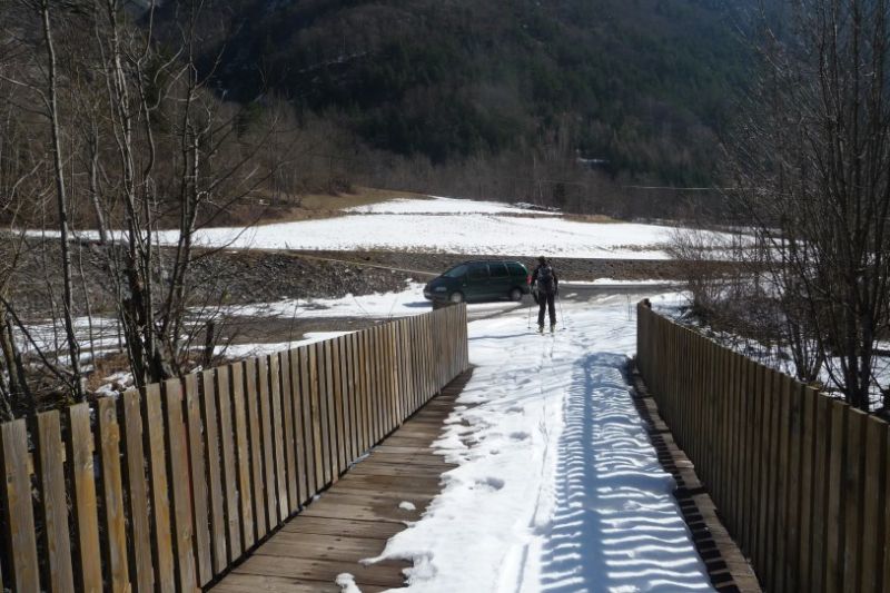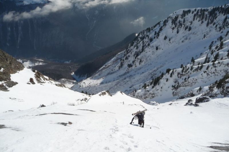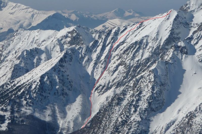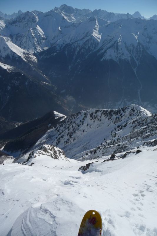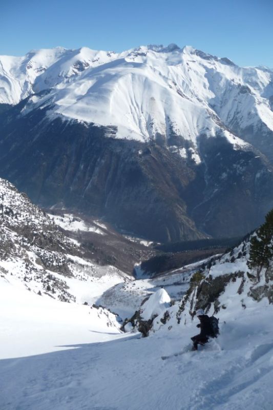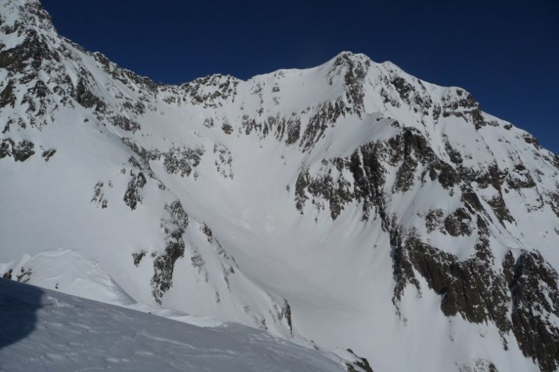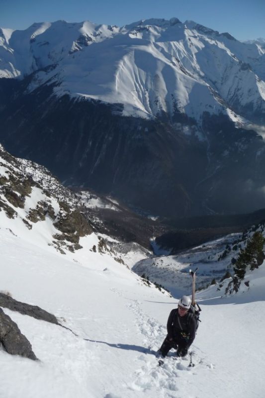 En faisant le Rocher du Lac par la combe de Cros il y a qq années [ici->www.volopress.net/volo/sortie2802.html] , j'avais repéré cette face et ses nombreux couloirs... Etant dans les parages, je me dis je vais faire une tentative pour aller voir, surtout que la neige est basse et que le chemin redescend à ski jusque la voiture. On peut choisir entre plusieurs couloirs qui sont plutôt orienté N, mais on a préféré la face NE qui sort au sommet. 600m de face et couloir. Cot 4.3/E3. La combe de Cros était en parfaite état sans boule et le couloir d'accès au Rocher du Lac était nickel. Photos + tard