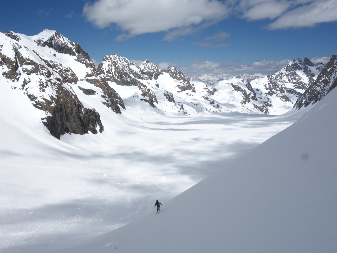 Les conditions sont exceptionnelles pour une fin mai, les températures nous permettent de skier toute la journée et les faces sont bien remplies. Réunir les bonnes conditions météorologiques et nivologiques tient plus du miracle que de l'expérience. Nous avons skié dans la poudre toutes les lignes du 1er jour. Nous en espérons autant aujourd'hui. Mais un micro phénomène sur le glacier Noir a dégarni les faces, le couloir N du col homonyme est en neige dure et peu rempli. On se concentre, ça passe ! Le Coolidge est en neige de cinéma,un rappel en haut, un en bas et il ne reste plus qu'une descente aujourd'hui. Une énorme avalanche en face sud de la Barre secoue notre optimisme. Pas le choix, il faut descendre tout en bas et remonter le glacier blanc, le couloir des Avalanches est trop dangereux. 2000 m de D+ plus tard, on se tient au sommet du pic Lory dans une ambiance irréelle. Après la face N et le couloir de Barre Noire, le refuge des Ecrins nous accueille et restaure notre fatigue. Il ne reste plus qu'un jour!
