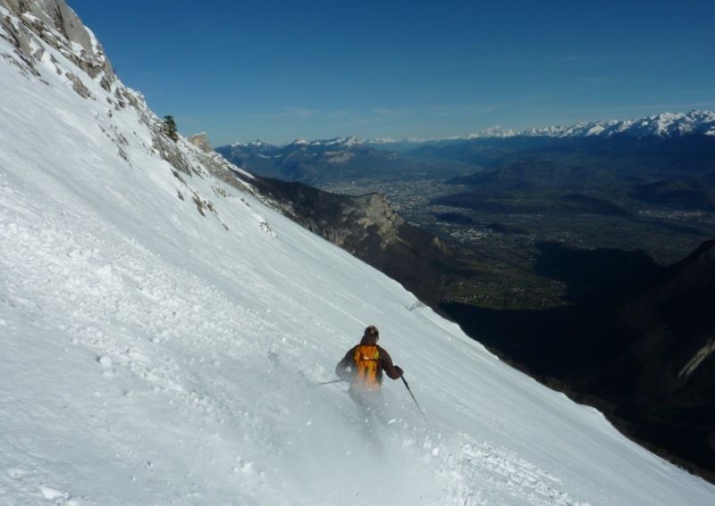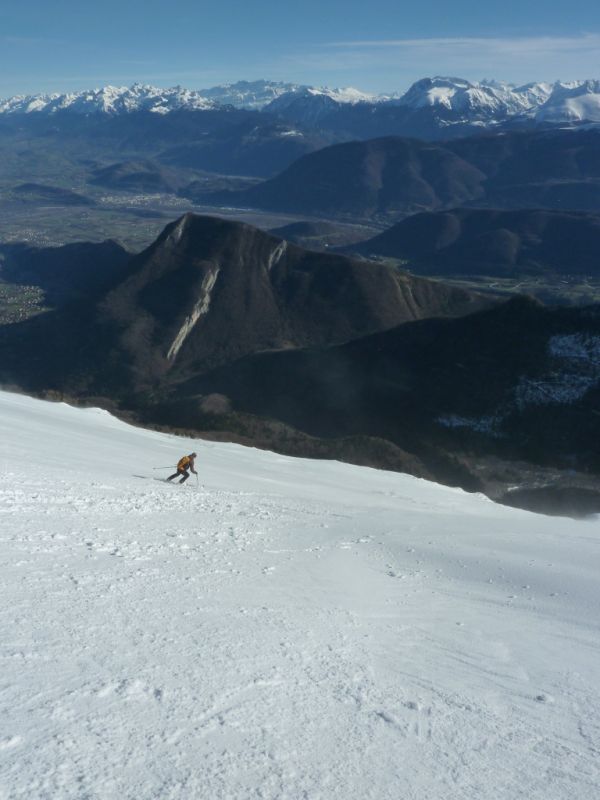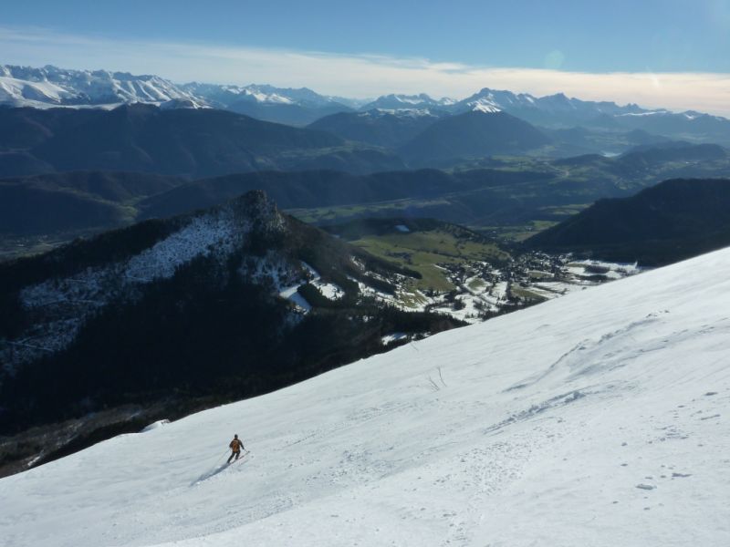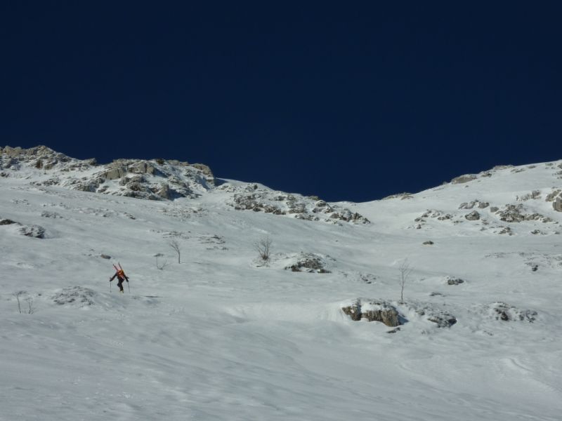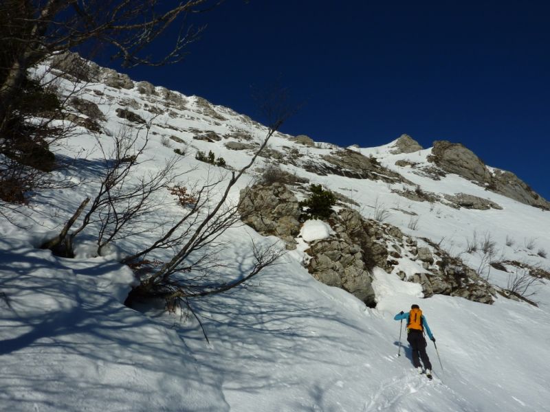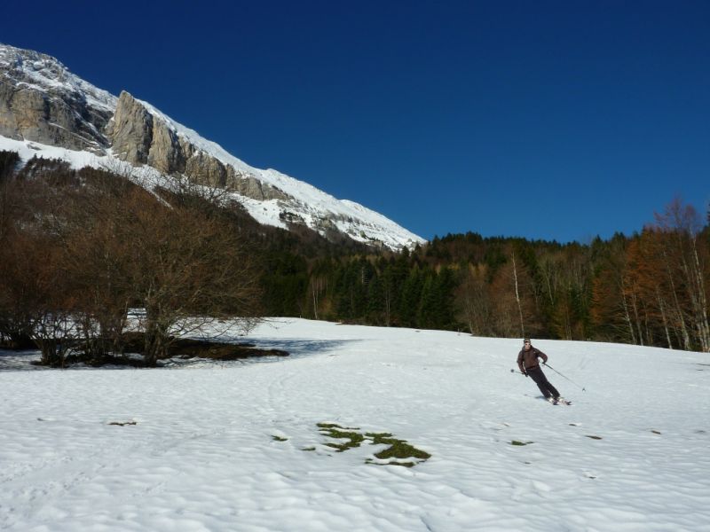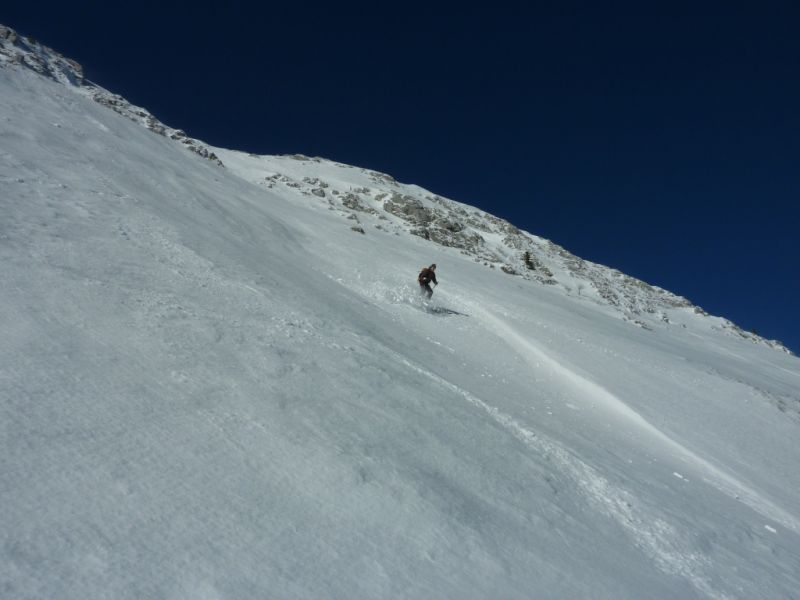 L'enneigement est très correct puisqu'on skie depuis et jusqu'à la voiture. Cela devrait encore un peu durer grâce à la piste de ski de fond qui démarre tout près. Sur les pentes supérieures, la neige s'est tassée, par endroit quelques rochers affleurent. Le manteau apparaît bien stable. Dans les petites dépressions abritées du vent, on trouve des passages en poudre tassée bien agréables à skier à la descente et des zones de croûtes réchauffées par le soleil mais pas de zones vitrifiées.