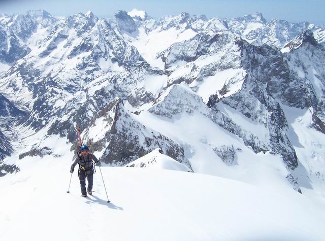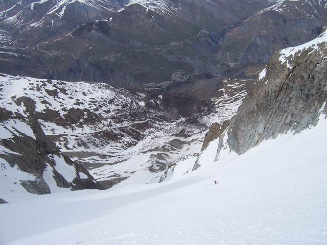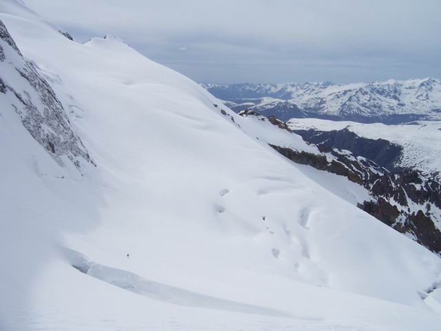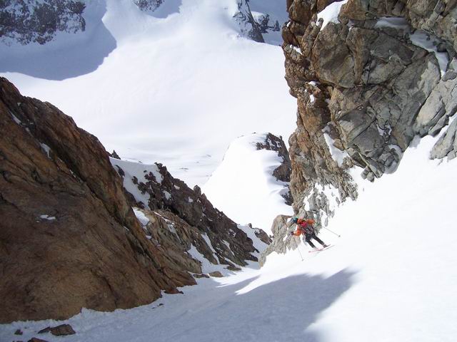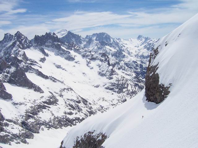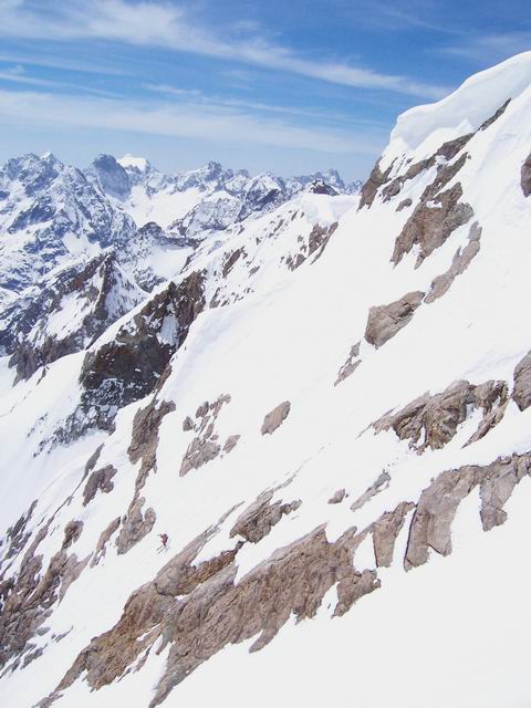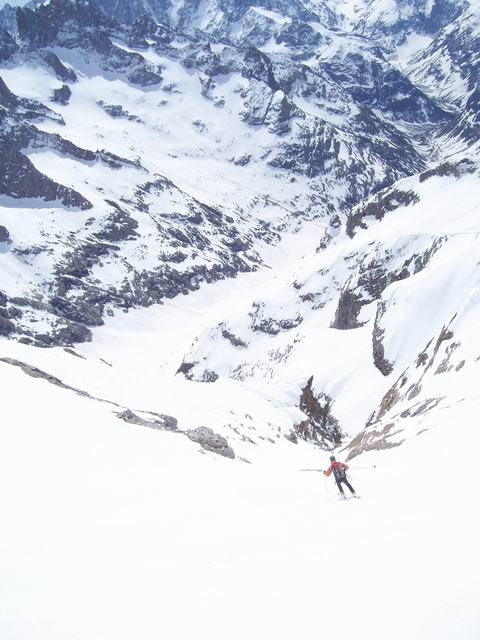 Somptueux circuit, avec en point d'orgue la passage au sommet du Râteau et la descente à vue de sa face sud-est. Petit coup de stress en s'engageant dans l'entonnoir du couloir, dont on avait pas réussi à s'assurer du remplissage lors de nos repérages précédents. La pente n'est jamais extrême mais rendue délicate par 4 ressauts étroits (1m50) et verglacés. Quand on a vu l'énorme bloc de corniche qui tient on ne sait comment sur l'arête, on a pas envie de déchausser. J'ai pourtant du m'y résoudre dans le dernier ressaut, au pris d'une manoeuvre skis/crampons plutôt acrobatique. Le couloir en lui-même n'est pas très skiant, quoique ce jour, les conditions y étaient parfaites. Mais l'ambiance y est extraordinaire. Ski grandiose dans les pentes menant aux Etançons, puis à nouveau pour la descente finale des Enfetchores. Beaucoup d'activité sur les tours classiques du coin.