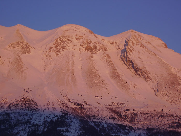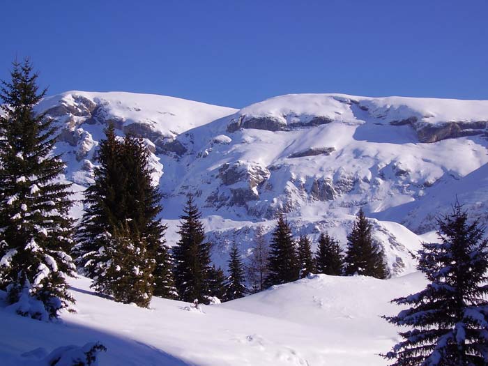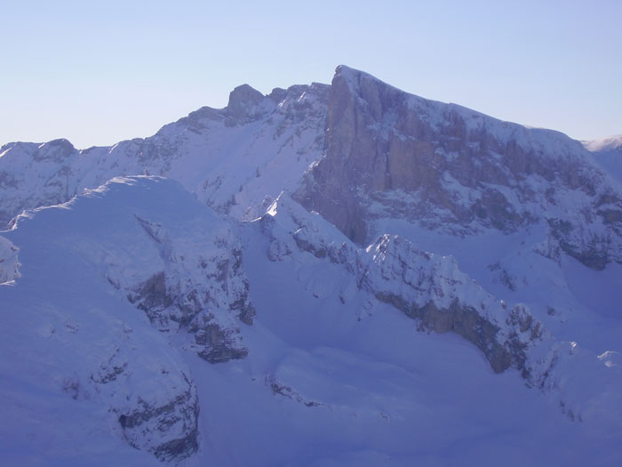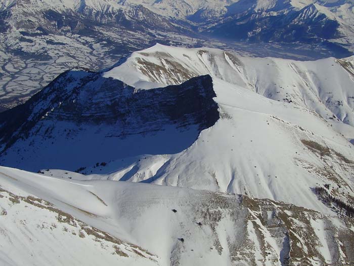 Dans la série " ne faites pas ce que je fais ", cette combe, sans doute bien jolie quand les conditions sont au rendez-vous, était ce jour un peu délicate à descendre. Comme on ne la voit pas à la montée, on conserve toutes ses facultés de surprise... Il n'en reste pas moins que le haut était très bon (poudre parfois légèrement compactée) vers 2100 et que dès la sortie vers 1850, et jusqu'à la route à 1610, c'est une poudreuse magnifique et quasiment sans touchette si on finasse un peu. Après, il vaut mieux garder la route jusqu'en bas, car les touchettes se multiplient. La variante F9.2 est encore plus à déconseiller, et l'étranglement à la base est déneigé. Les couloirs de le montagne de Faraut sont enneigés (le haut de la combe Chave un peu moins), mais les plaques sont sans doute présentes : patience, donc ! Très peu de monde dans le Dévoluy pour un dimanche.