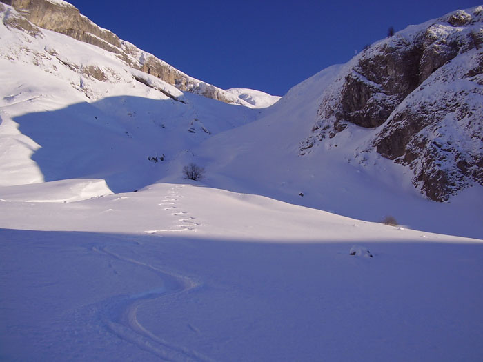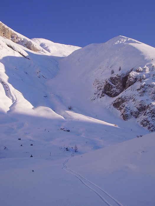 Dans le haut de la combe de descente, entre 2200 et 2250, présence de plaques friables de 10 à 20 cm d'épaisseur dans le creux et de plaques plus dures sur les rives. Du coup, j'ai préféré remonter, car du dessus, on ne voit pas bien et il y a du rocher sur la droite. La combe proprement dite a été très soufflée, sa rive droite est soit gelée soit plaquée dure avec de nombreux rochers épars et des irrégularités du terrain ; sa rive gauche est bien plaquée avec des pentes assez raides et chargées au-dessus. Du coup, j'ai choisi de descendre la moitié de la combe dans le creux, au fond dur avec parfois de petites plaques de surface partant sous les skis. C'est très étroit, souvent moins de 2 m, j'ai dû alors desendre en escalier...
