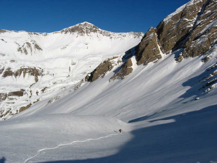 Toujours risque 2 en NO-N-NE. Rien ne bouge dans le secteur. Quelques petites plaques ont décroché dans les jours précédents sous des rochers dans des orientations NO (une sous le point 2216 en bout d'arête N de Revire Souléou). Le final de roche Méane (en fait un petit couloir tournant juste à l'E et débouchant quelques mètres plus bas sur l'arête) était en poudre liée sur fond gelé ou cailloux en RG et cartonné en RD, mais tenait quand même assez bien. Nous avons consciencieusement nettoyé le haut du couloir en le descendant en escalier. La facette de roche Méane nous est apparue plaquée dans sa seconde moitié (vaguelettes formées par le vent, pas d'ancrage supérieur et cailloux apparents).