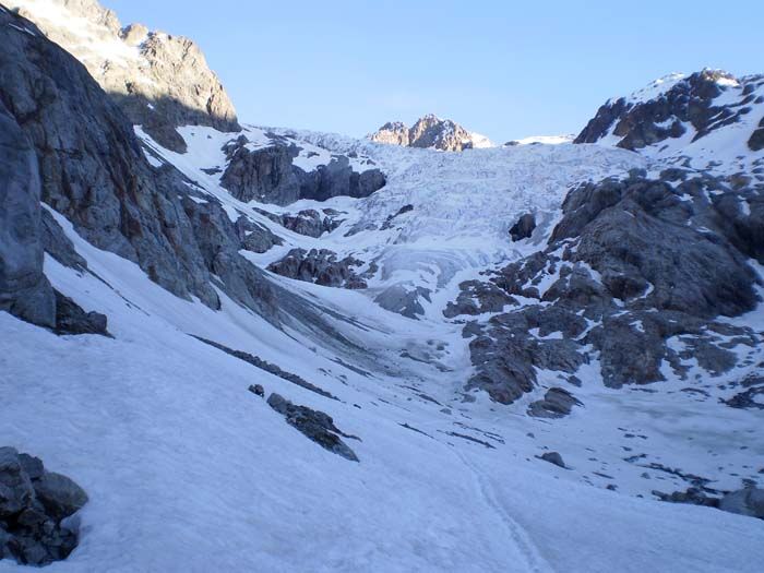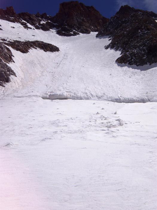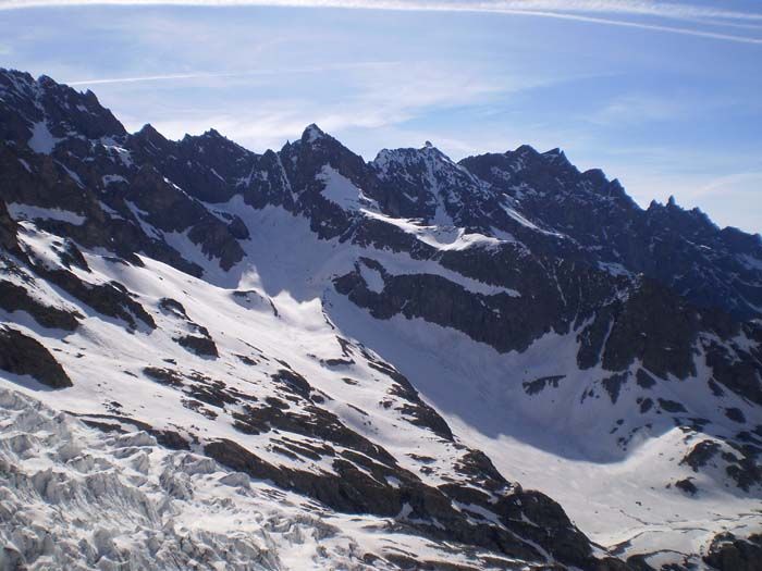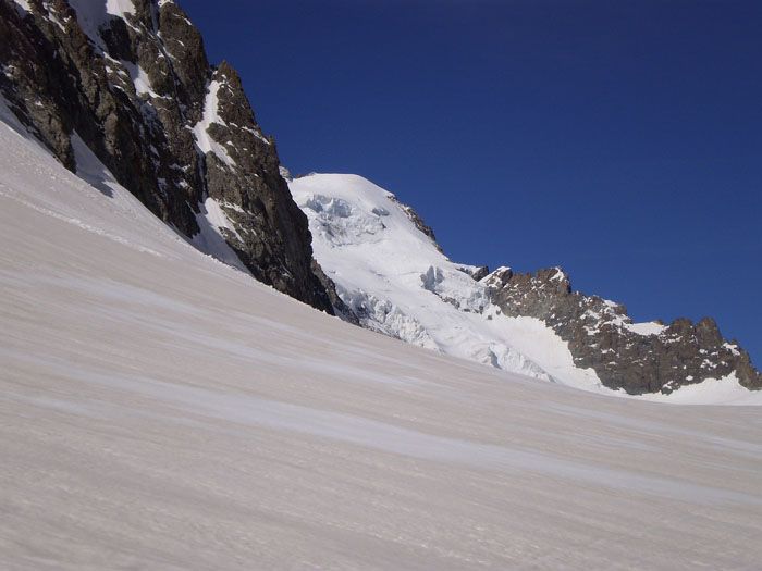 Excellent regel, meilleur que ce que j'attendais. Du coup, pas un caillou n'a bougé dans la montée par la rive droite entre 7 et 9h. De gros morceaux de séracs sont tombés tout près du bas du couloir de barre Noire en provenance du gros rognon rocheux, et il reste encore des immeubles en équilibre...