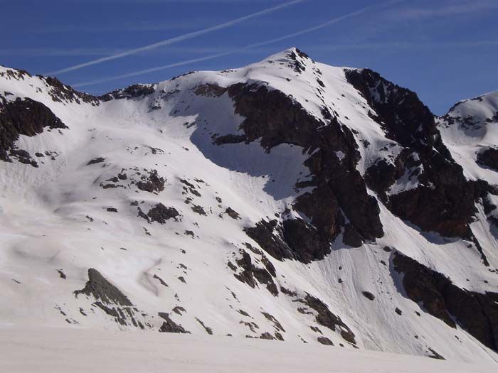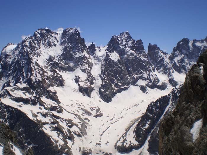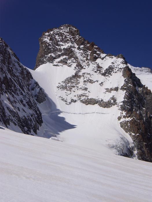 Montée par la rive droite du glacier Blanc jusqu'au pied de barre Noire. Crampons entre 3350 et 3450, 10 m au-dessus de la rimaye. Chaussé les skis à la rimaye, re-peaux à 2240 pour remonter au col de la grande Sagne. Descente du versant nord puis par la rive droite de montée.