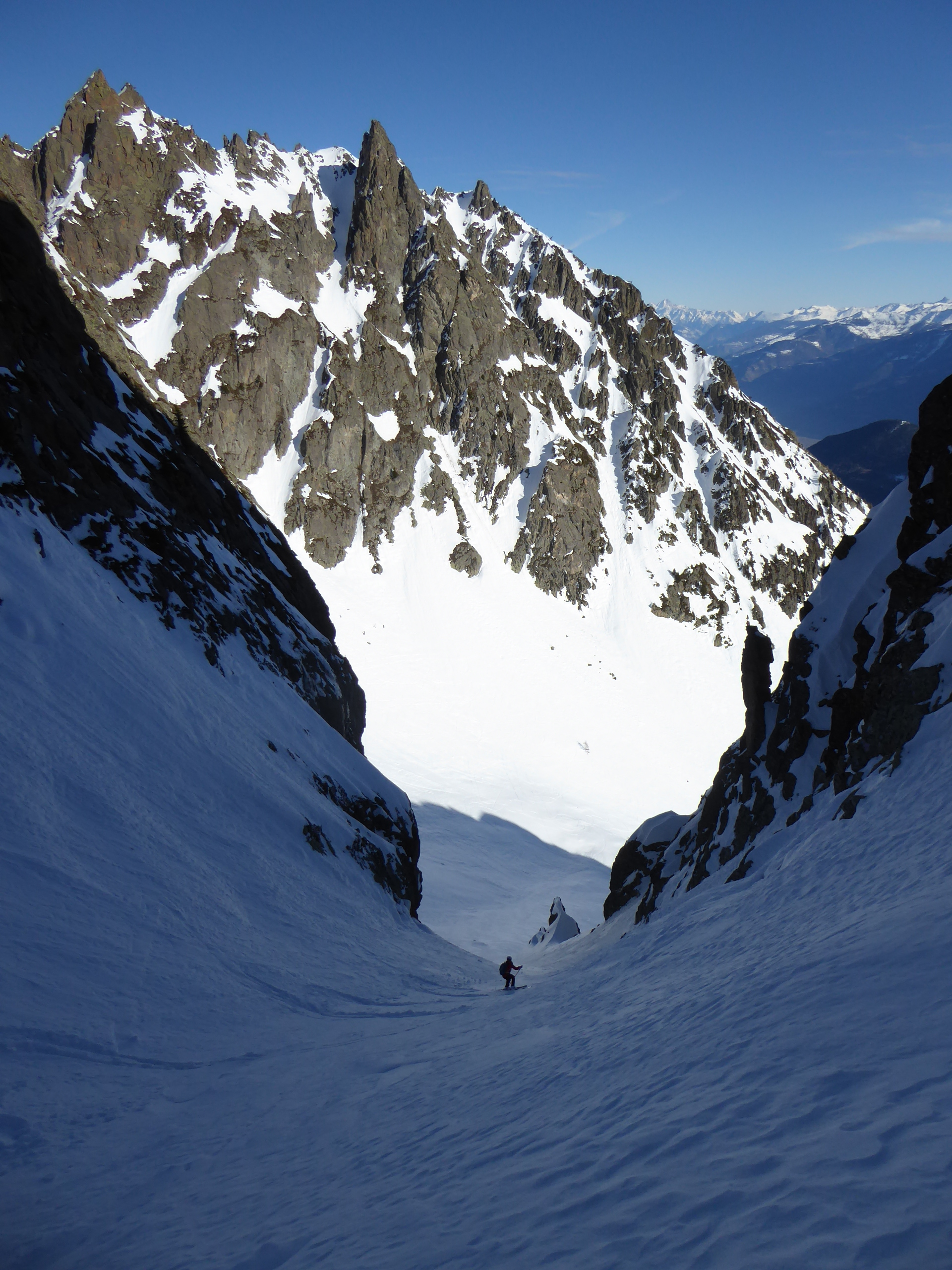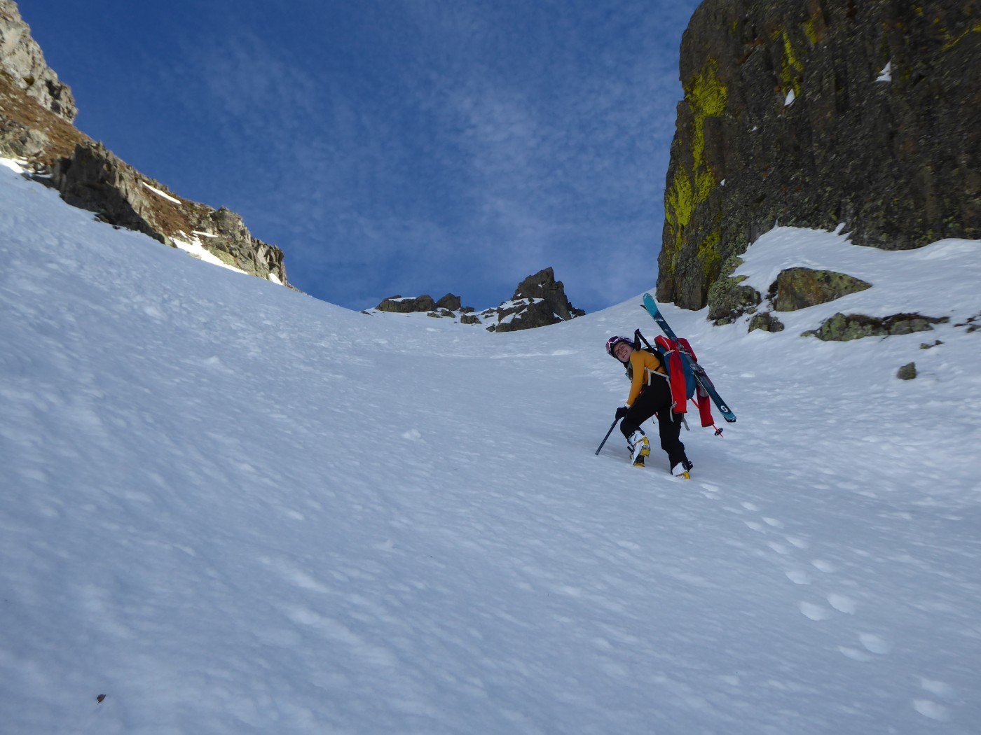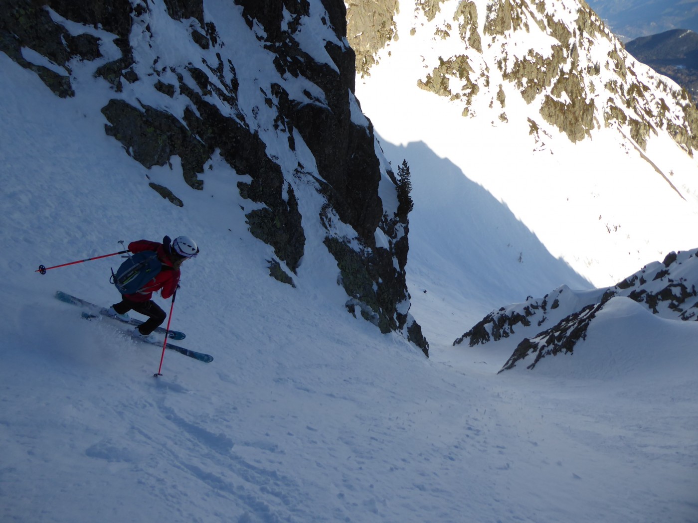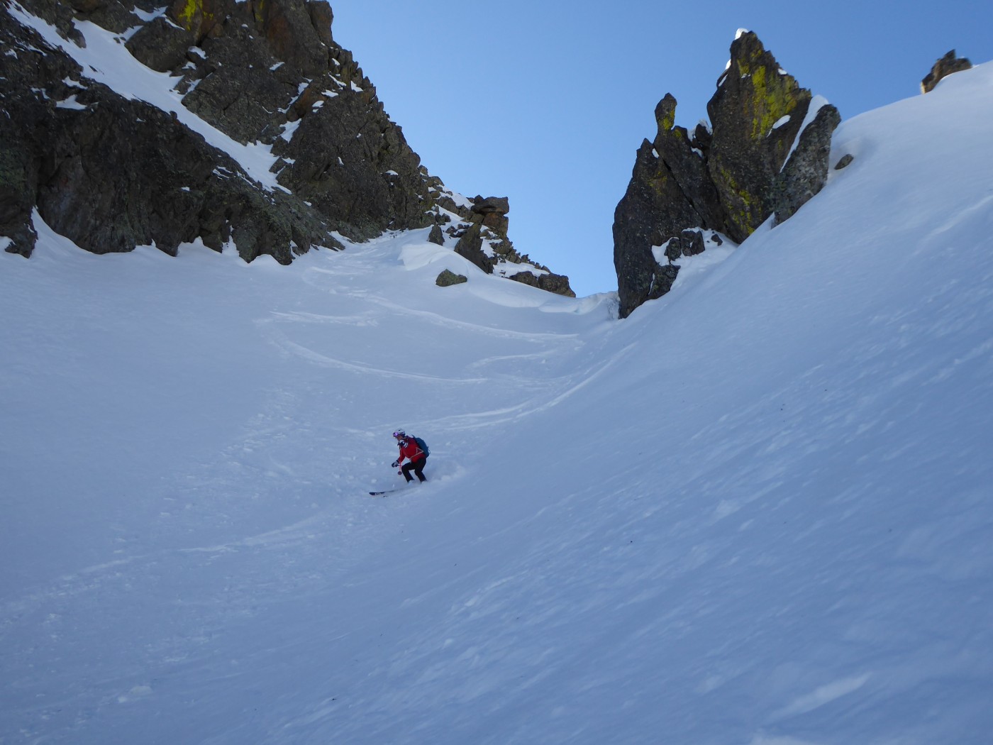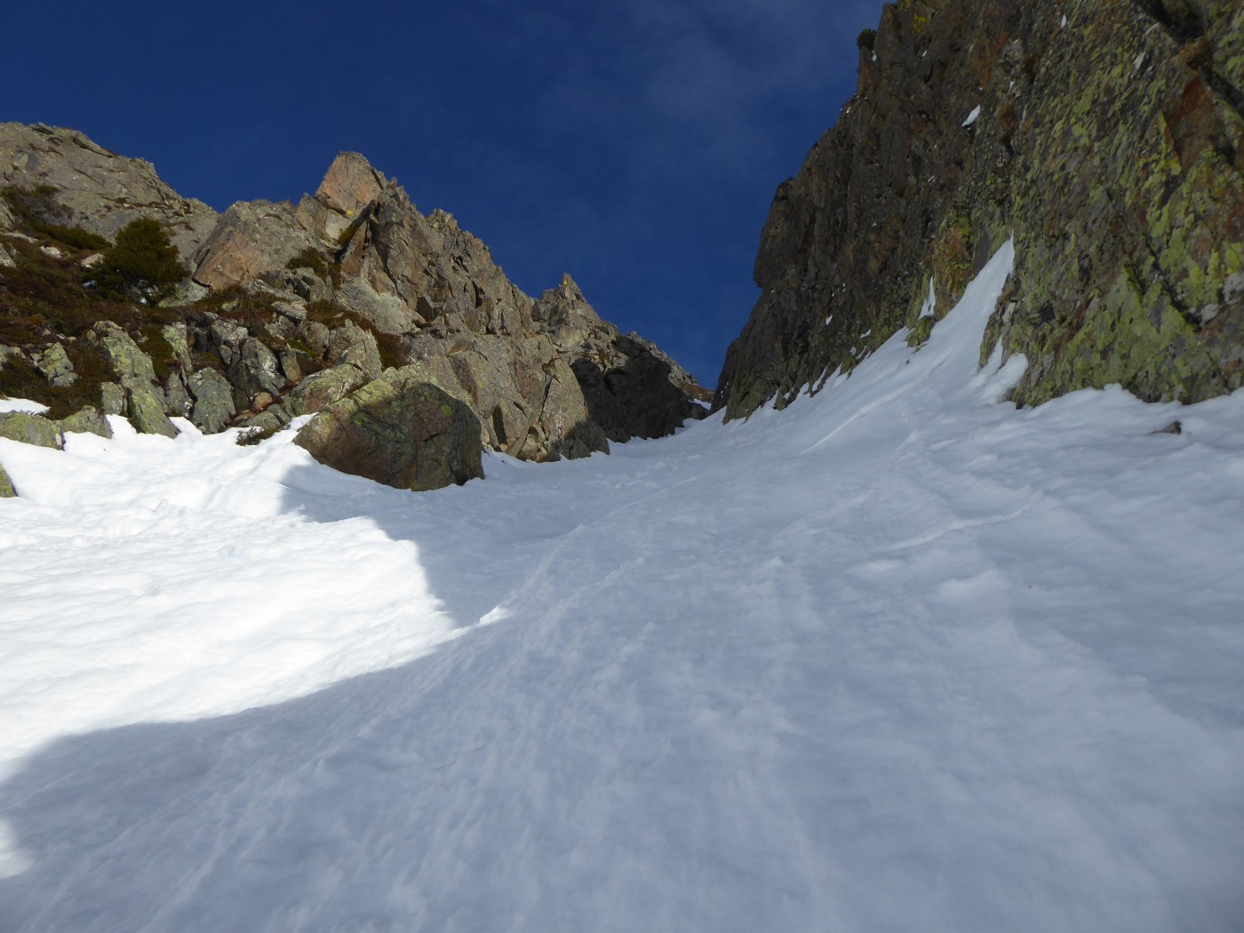 Le deuxième couloir est plus raide et plus étroit (4.2/E2) que les autres de cette rive droite de la comba Rossa. Il était non tracé.