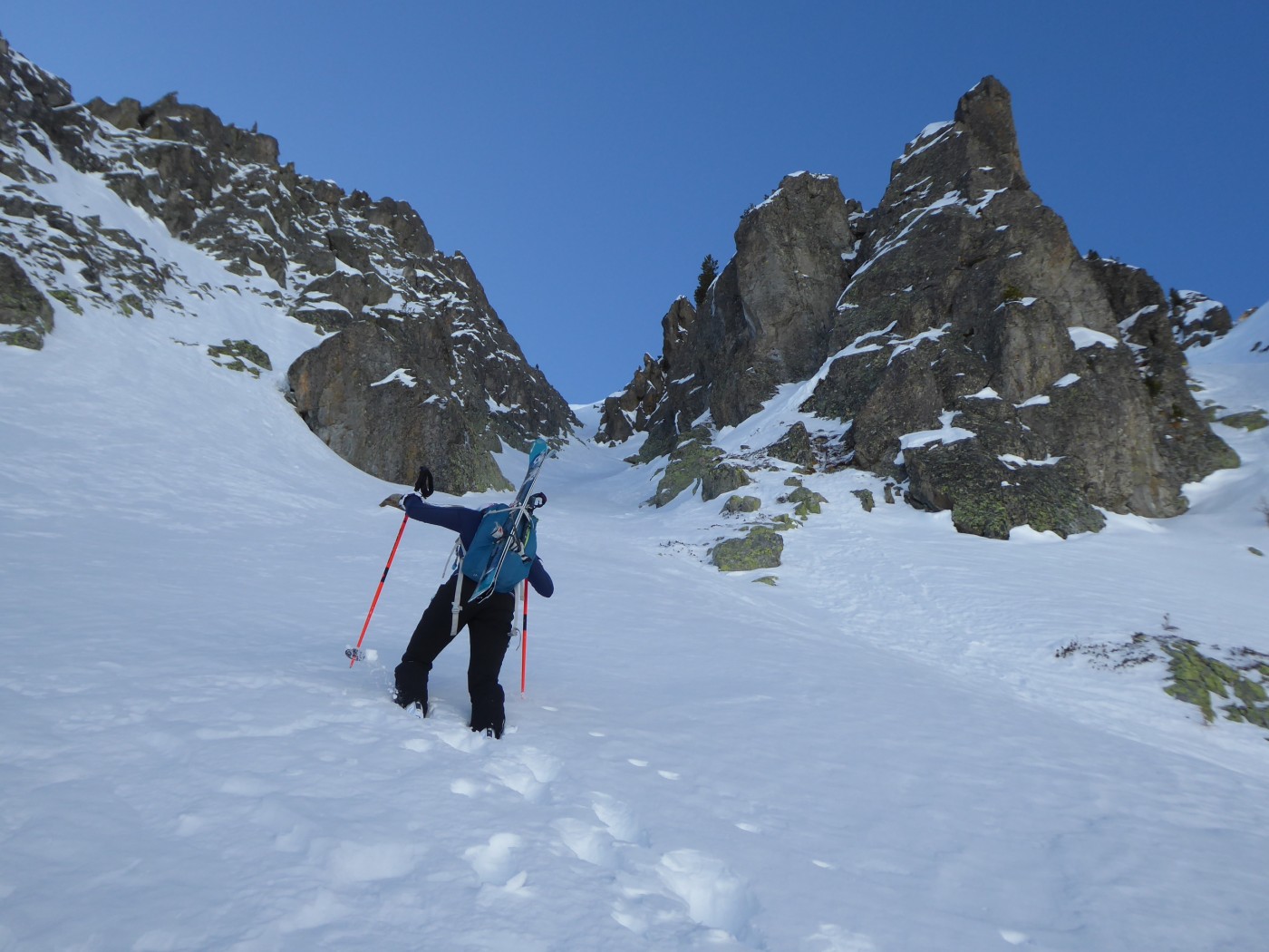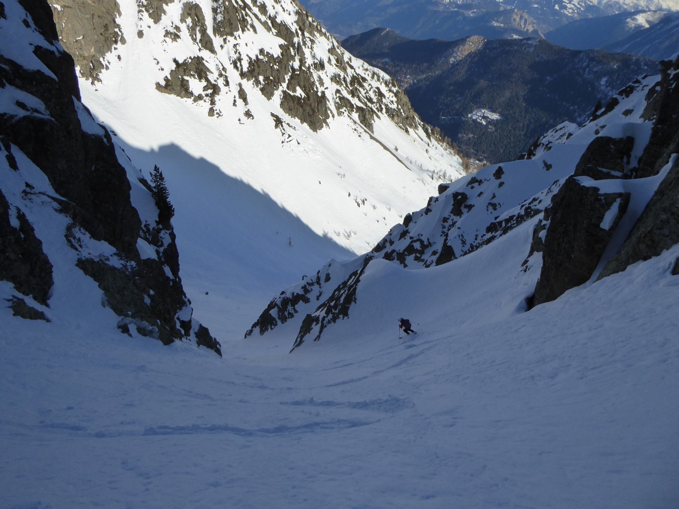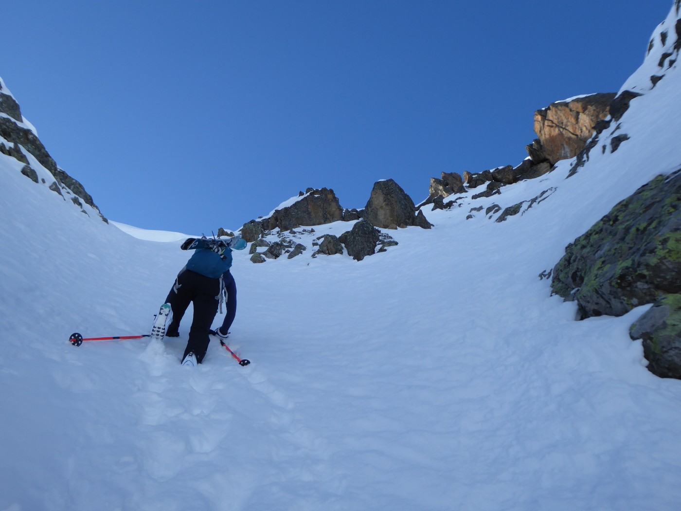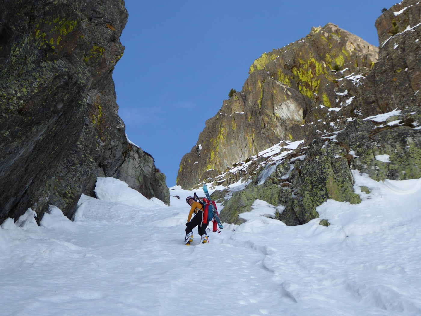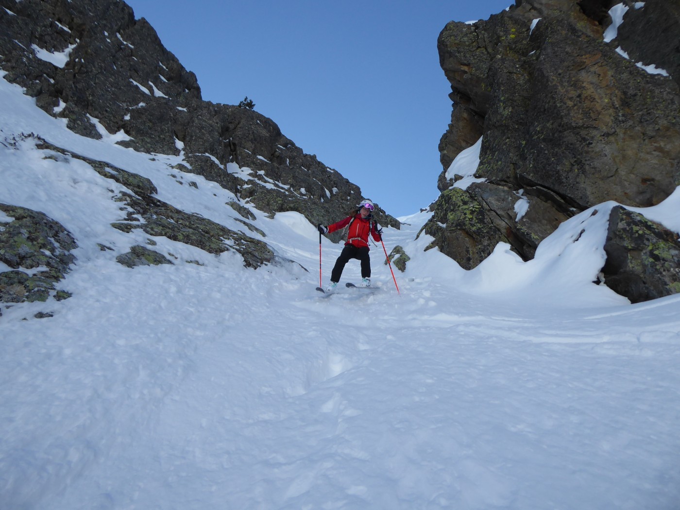 Le deuxième couloir est plus raide et plus étroit (4.2/E2) que les autres de cette rive droite de la comba Rossa. Il était non tracé.