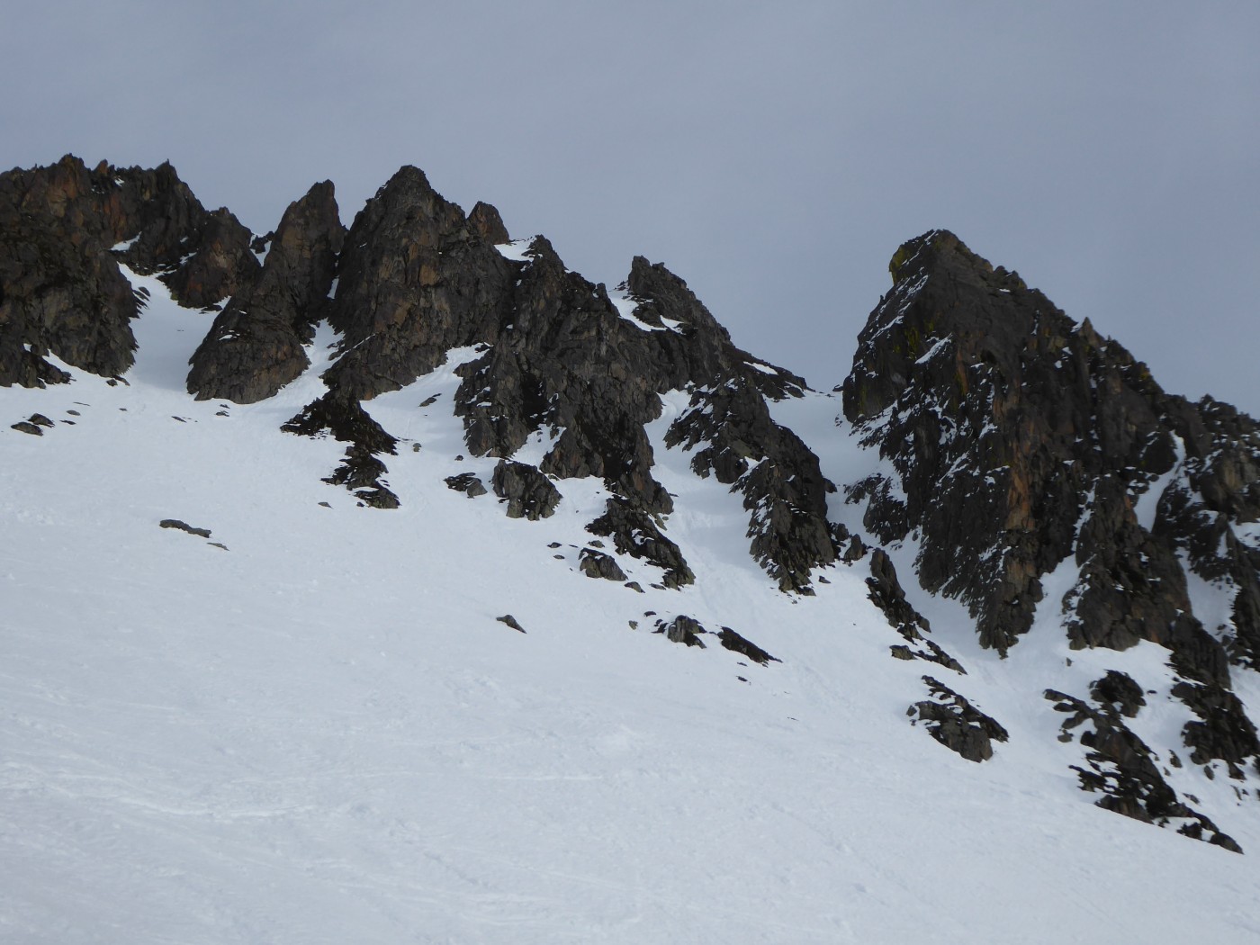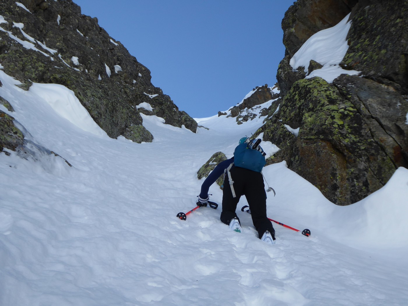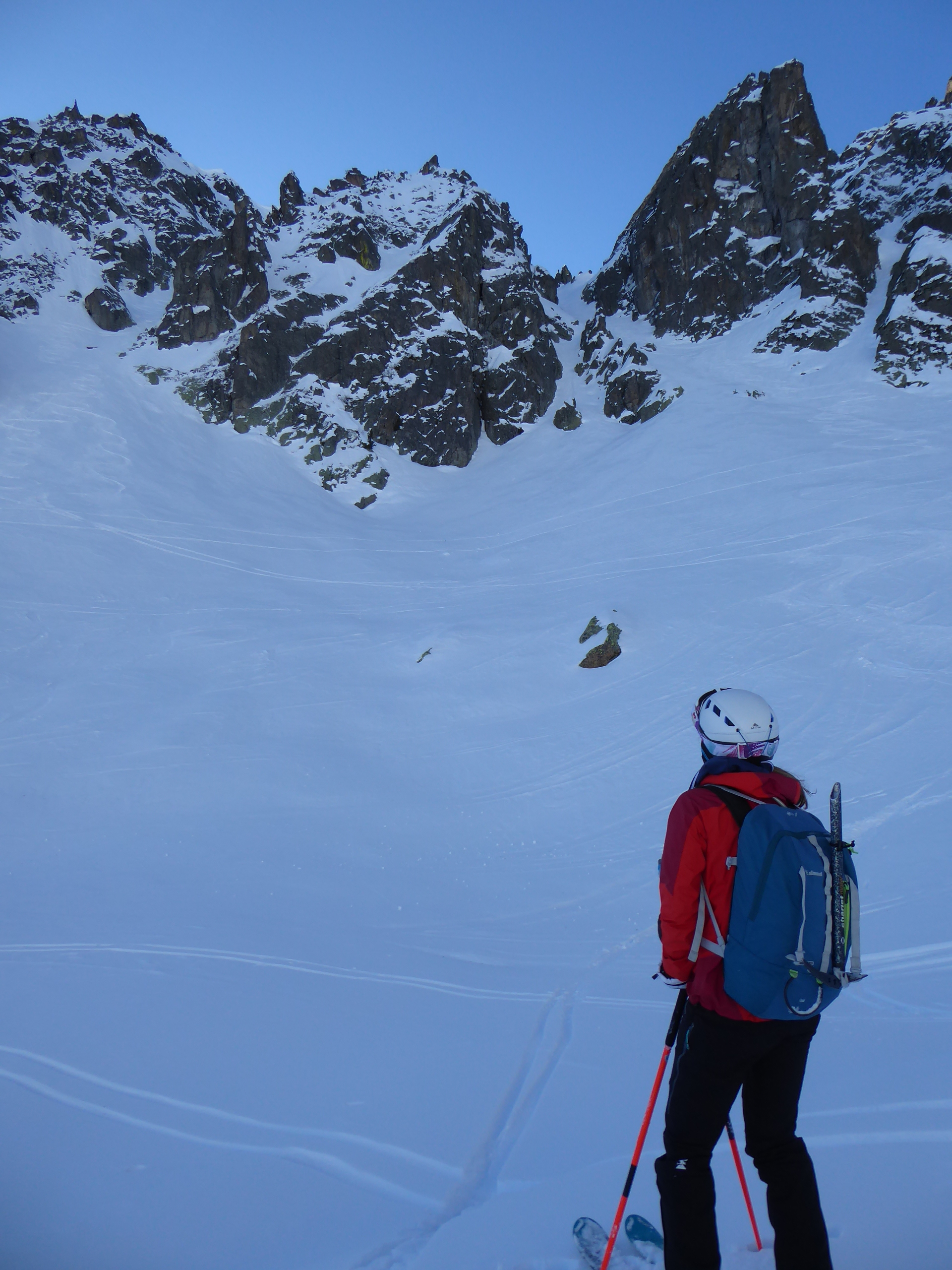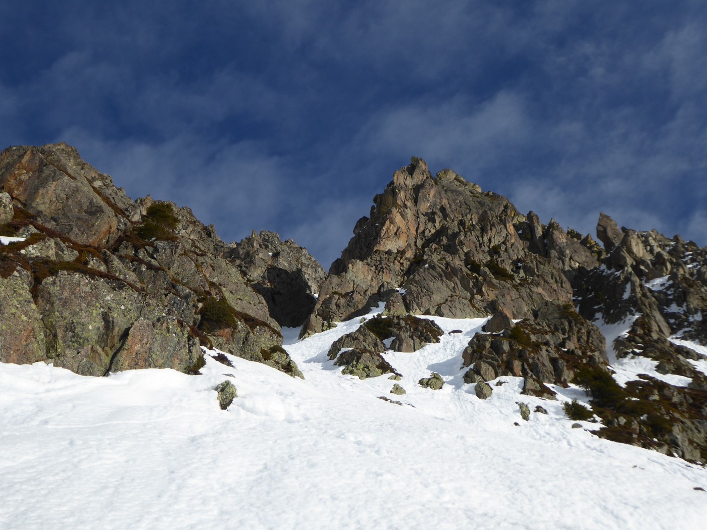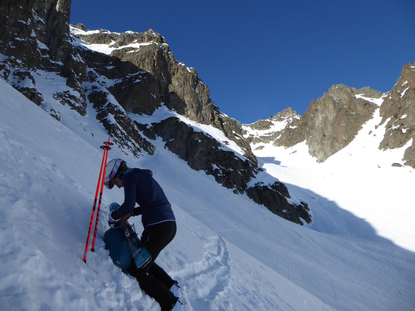 Le deuxième couloir est plus raide et plus étroit (4.2/E2) que les autres de cette rive droite de la comba Rossa. Il était non tracé.