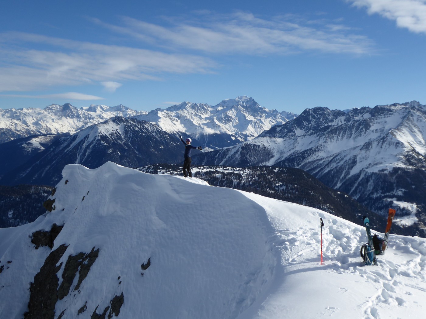 Finhaut, Fenestral par la piste forestière puis les chemins sous la Comba Rossa. Remontée du couloir SO menant en haut du couloir NE de la Rionde situé au nord du sommet. Rionde en AR à pied. Descente de ce couloir. Couloir NE de la Rionde situé au sud du sommet en AR. Descente sur Finhaut par la piste forestière.