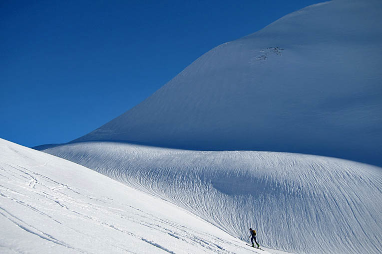 Neige typée printemps en versants chauds mais pas sur une grande épaisseur => le créneau moquette est donc serré. Si on est trop tard, on s'enfonce dans la lourdasse. A noter que là où ça n'a pas glissé, la montée à pied même en sud dans le raide passe sans crampons car on casse la croûte. Fort heureusement, pas en descente avec les skis... En versants froids, la pluie est montée à 2400. En-dessous, c'est généralement pas mal sauf curieusement dans la descente rg du Couard où la croûte de surface n'était pas regelée, permettant du ski agréable quand ce n'est pas criblé de traces.