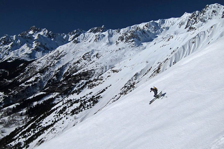 La Villette => Rissiou => descente couloir sud encore vierge (extrême droite de la face) jusqu'à la route vers 1700 m => Sabot puis Aiguillettes => descente face sud puis rive gauche Couard.