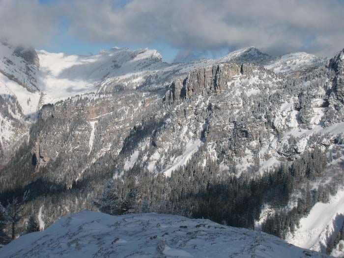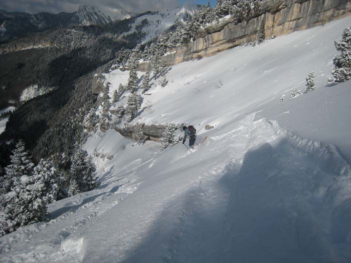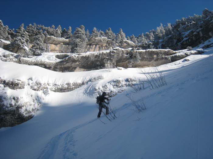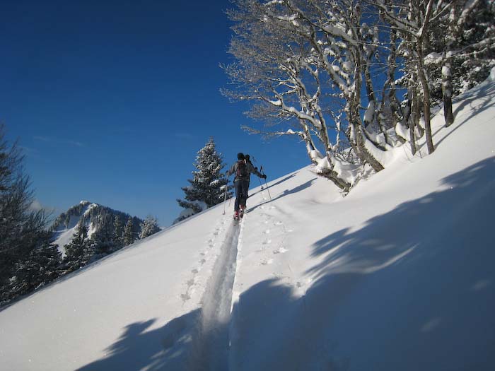 Les sous bois denses ne sont pas si enneigés que cela, sans comparaison avec les derniers hivers 2005 ou 2006. En dessous de 1300m, il reste pas mal de branches apparentes, sur lesquelles il ne doit pas faire bon se vautrer. Fort heureusement la sous couche est dure.