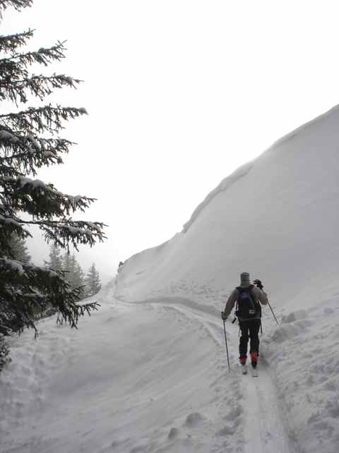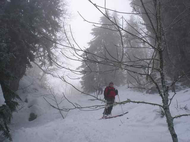 Belle combinaison. Surprenante descente, en particulier au passage du canyon, dans une ambiance mystérieuse renforcée par le brouillard. Dommage pour la neige lourde, la descente fût passablement physique. A refaire en neige légère !