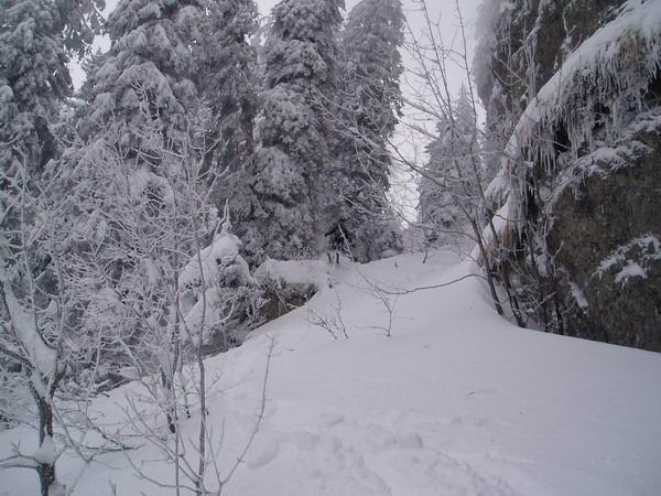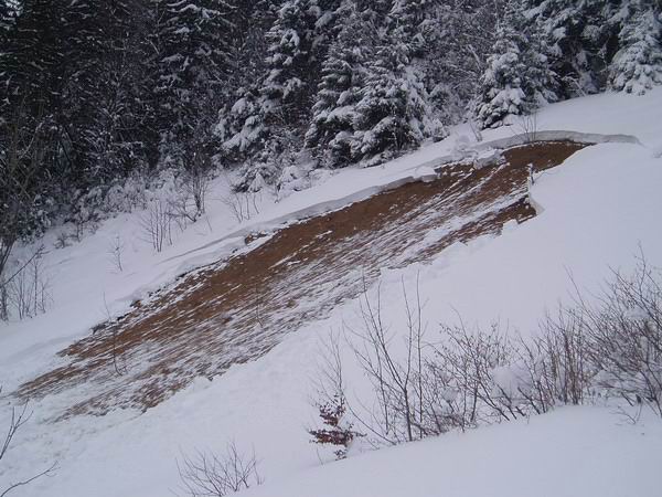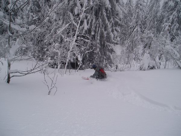 Poudre dense sur tout le parcours. Pente d'attaque bien chargée, le reste est entièrement en forêt. Beau décrochage jusqu'à l'herbe en est dans l'avant dernier lacet de la route (voir photo)