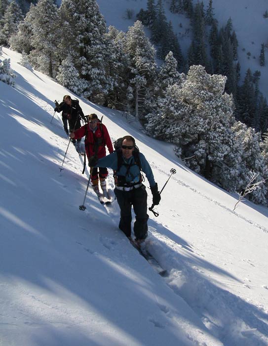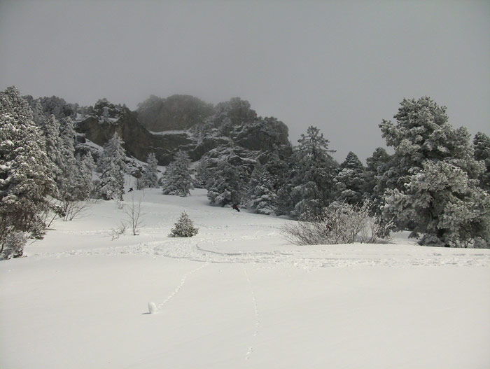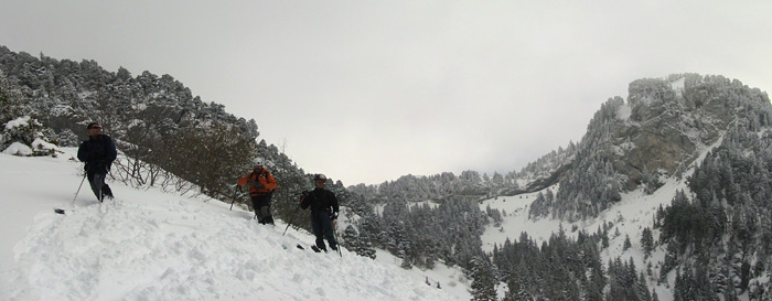 à la fin de la descente sous le versant ouest de Poyez je tire à main gauche dans un petit goulet qui va m'amener dans la cuvette du Lac où on va repeauter pour remonter à la Rossane.