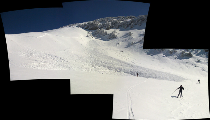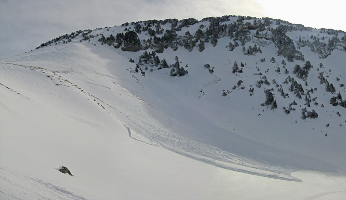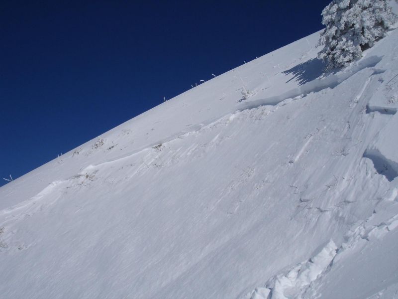 Déclenchement en bas du versant à la descente d'un petit panneau orienté sud, qui à fait partir les 3/4 du versant sous le col de la Rossane (largeur 100m, cassure max 50cm sur 150m) : cf.commentaire