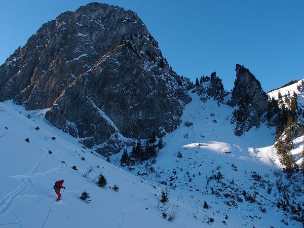La montée au Roc fût pénible à pied dans cette neige inconsistante, j'ai emprunté un couloir plus à droite que le couloir classique mais mauvaise pioche ! On s'enfonce jusqu'au nombril entre les rochers.