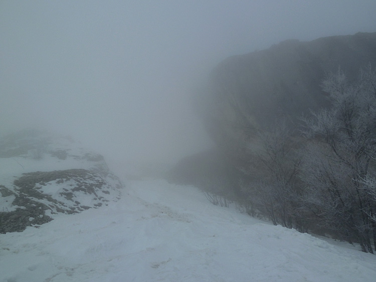 En partie haute, j'ai emprunté à la montée un couloir étroit assez évident qui comporte un passage bien abimé au niveau de la portion la plus raide puis un buisson bien chiant d'arcosses vers 1650 m.