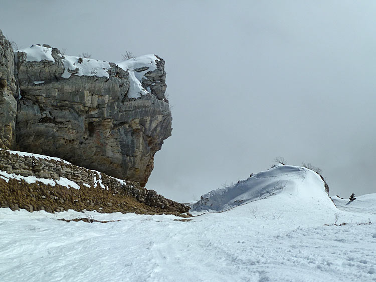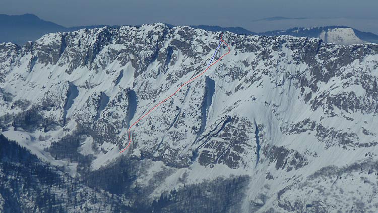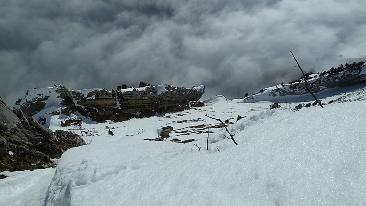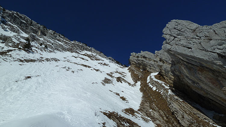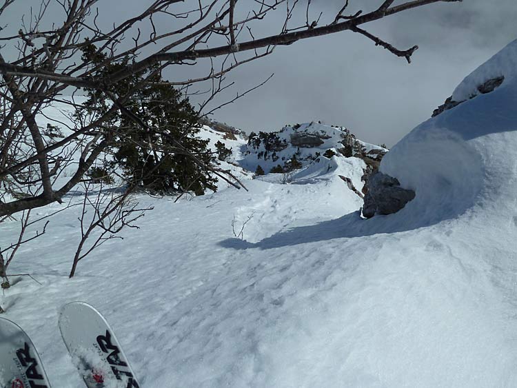 Du coup j'ai un peu pinaillé avant de trouver le bon passage skis aux pieds, l'idée première était de passer par une rampe (qui s'avère être une bande de neige d'1 m plein gaz sous des rochers), demi-tour vers la crête, avant de voir que ça passe en descendant le petit couloir sur 40 m puis de traverser à gauche (remontée d'1-2 m) pour descendre une pente plus nord-est.