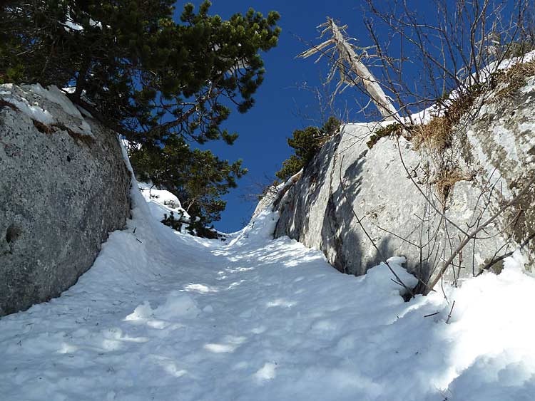 Du Mont-Devant, montée au col de la Frasse puis versant est du RDB, pour trouver l'entrée de l'itinéraire (un petit couloir) en longeant le versant 200-300 m vers le nord. Sortie sur la crête vers 1730 m (cf.photo)