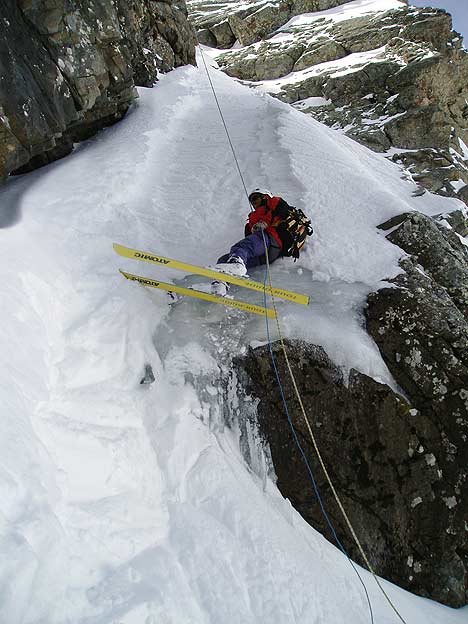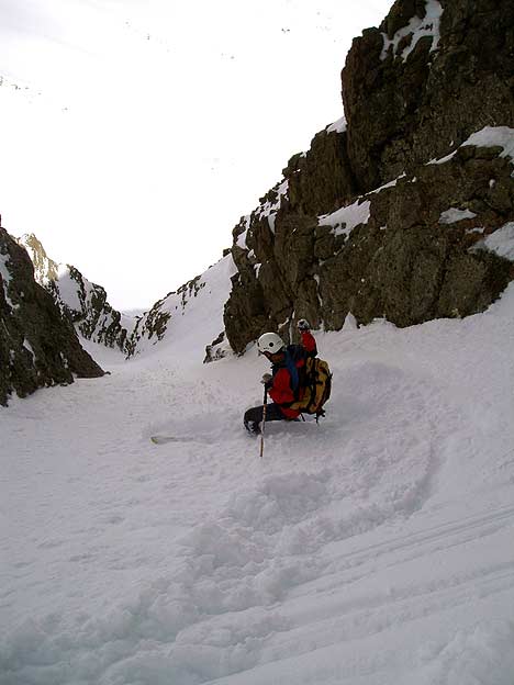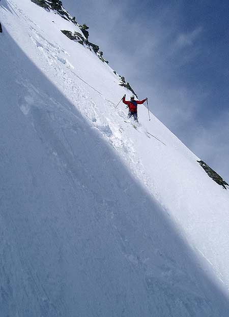 Repéré lors d'une virée avec Jean Bouchet à Noël, je l'avais oublié pour cette année mais les récentes chutes de neige l'ont remis au programme. Malgré la brièveté de l'approche depuis Merlette, c'est à prendre très au sérieux d'autant qu'on descend à vue (on peut toujours le remonter bien sûr mais c'est moins esthétique et beaucoup plus fatiguant). Un must du coin, une des courses les plus raides d'Ecrins sud avec une grande ambiance. Ca rappelle parfois l'Infernet avec le petit bout de ficelle au milieu, en plus court bien sûr. Merci à Sergio de m'avoir remué le matin car j'étais un peu fatigué suite à la remontée du glacier Long la veille. Au final, une grande course.