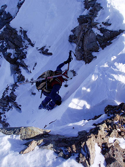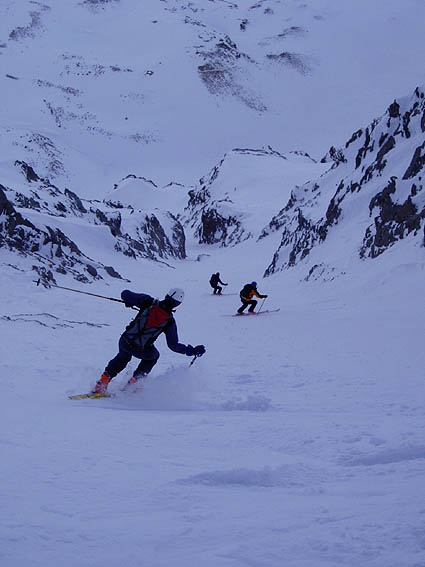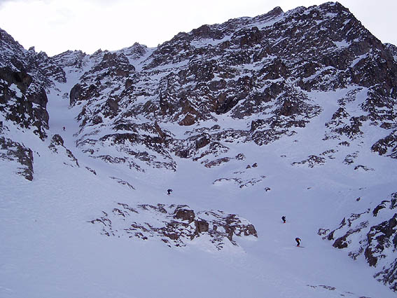 Une courte journée mais du bon ski dans le couloir. Une neige tassée, assez dure en général mais avec une bonne accroche. Décidement, on n'a pas fini d'épuiser ce coin du Lautaret. On s'en est tenu là pour aujourd'hui ; ce couloir semble être le meilleur plan du secteur, et puis, la météo commençait à se couvrir. A noter la mauvaise neige glacée dès que l'on quitte les pentes encaissées. Aujourd'hui, il ne fallait pas emmener un débutant au col de Laurichard (A1).