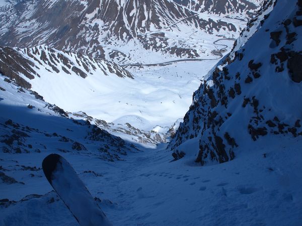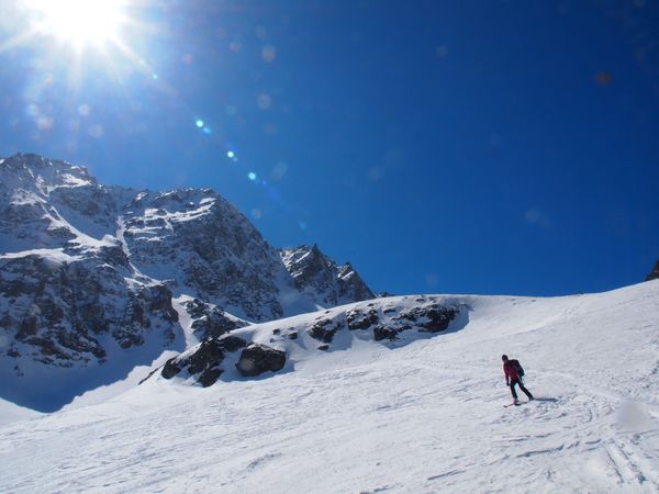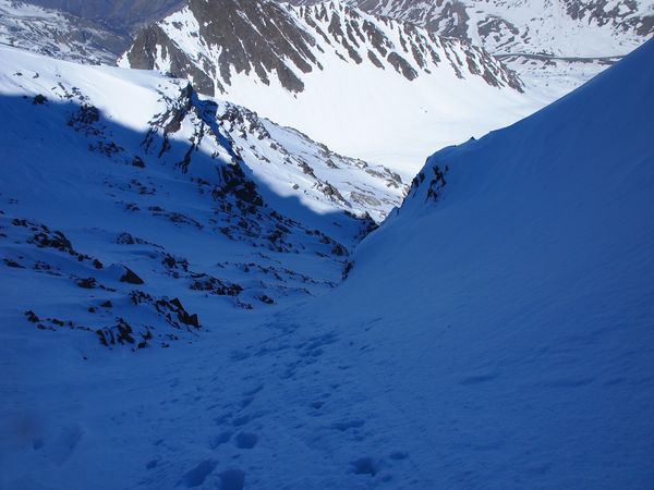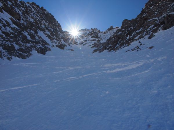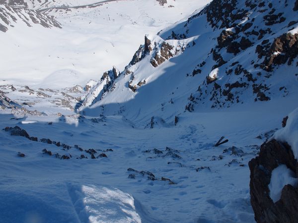 Je m'attendais à mieux dans le couloir, la neige était en partie cartonnée. Certes c'est plus que correct mais pas si excellent qu'espéré! La trace à pied était un vrai calvaire (surtout seul!) si bien que j'ai remis les ski à pas mal d'endroit. Il y a quand même beaucoup de touchettes à la descente, il faut se méfier des contre-pentes. Le sommet du couloir ne ski pas, trop de cailloux. J'ai quand même voulu skier l'étroiture du haut, mais ça racle avec des lattes d'1m80.