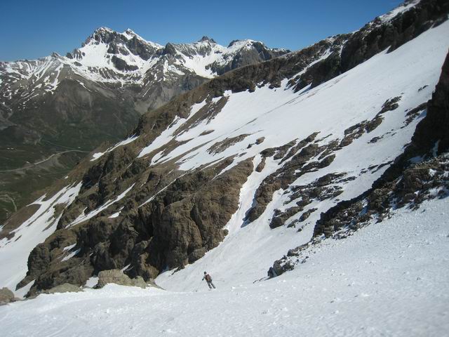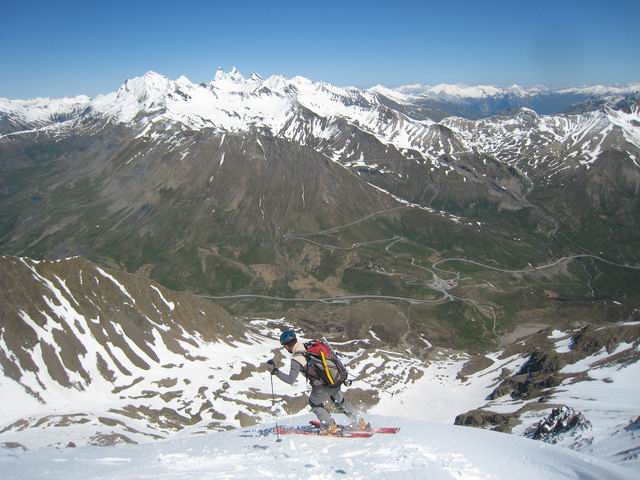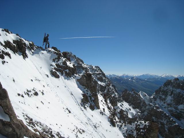 Comment skier seuls, ou presque, au Lautret (3 ou 4 personnes au pic ouest et c'est tout) C'était une sortie repérage nivologique qui a anéanti nos espoirs de pentes en poudre pour les jours suivants. Montée du couloir dans cette croûte qui casse a pied (mais pas à ski). S'en suit un petit parcours d'arête péteuse évitable par le sud (ce que j'ai fait) et descente dans cette belle face presque suspendue et sa pente d'accès en S. Très bon ski, en haut la croûte porte et grippe bien, bas en névé moquette. Photos + tard