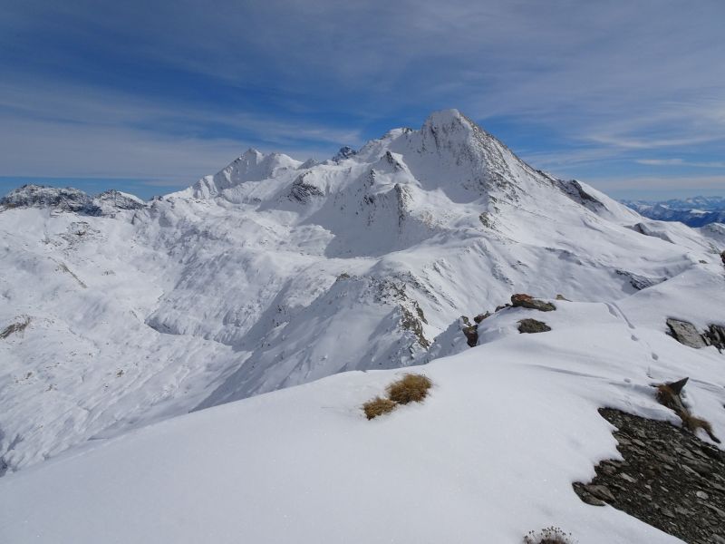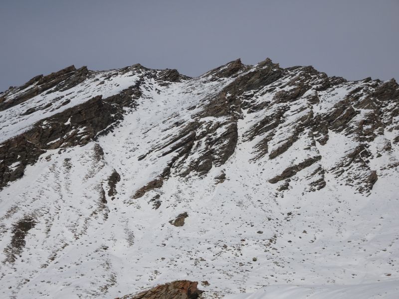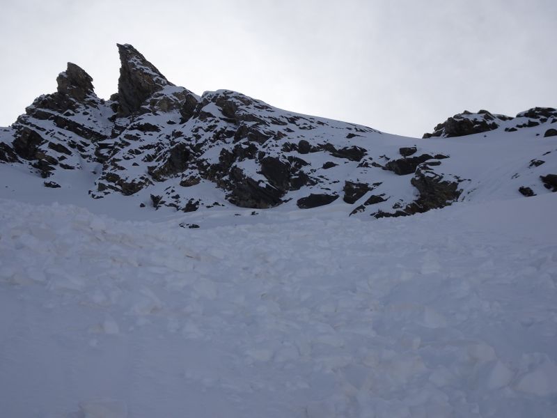 Je n'aurais pas parlé de cette sortie d'avant saison mais j'ai mauvaise conscience de ne pas dire ce que j'ai constaté aujourd'hui. Une heure devant moi, un skieur qui traçait Rocca Rossa a déclenché sous les rochers de la dernière pente une plaque épaisse de 60cm qui l'a bousculé, sans mal heureusement. Le danger est bien réel dans ce type de pentes d'altitude. Ce matin même parti pour le tour supérieur d'Asti j'ai changé de projet à cause d'une grosse plaque défendant la brèche supérieure de Giarus.