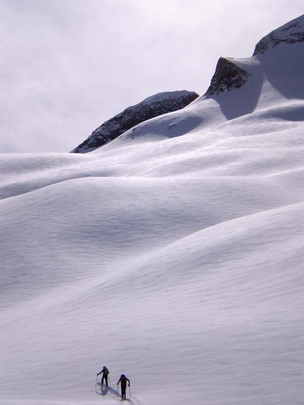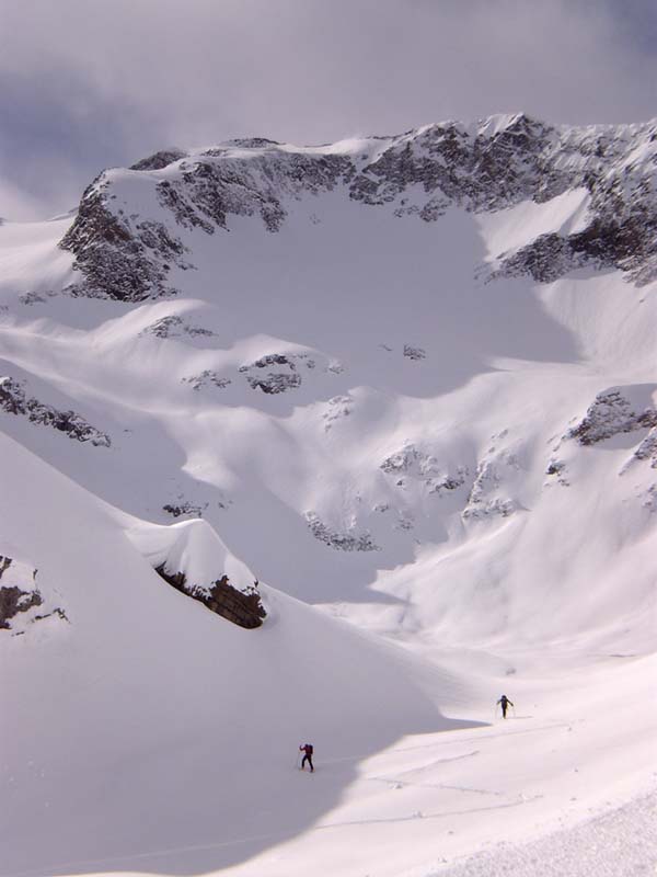Neige excellente dans les 500 premiers mètres en haut puis s'alourdissant à peine un peu. Sous 2200 environ en rive droite, les coulées ont durci le manteau et y ont laissé beaucoup de reliefs, mais ça se skie sans trop de problèmes. Nous sommes partis en même temps qu'un Dromois et un Grenoblois, Arnaud et Bruno, que je salue ici et nous avons fait équipe jusqu'en haut. Descente également en leur compagnie. Trois autres skieurs sont arrivés juste après nous et 3 ou 4 autres montaient plus loin. Quelques skieurs ont descendu le pic du Col d'Ornon est. Crampons et piolet recommandés pour parcourir la vire le matin. Couteaux presque inutiles.