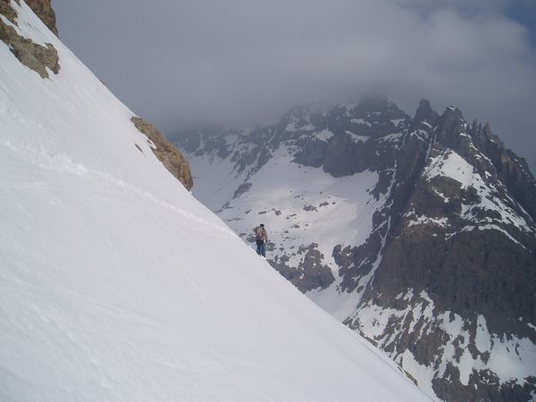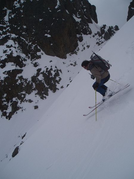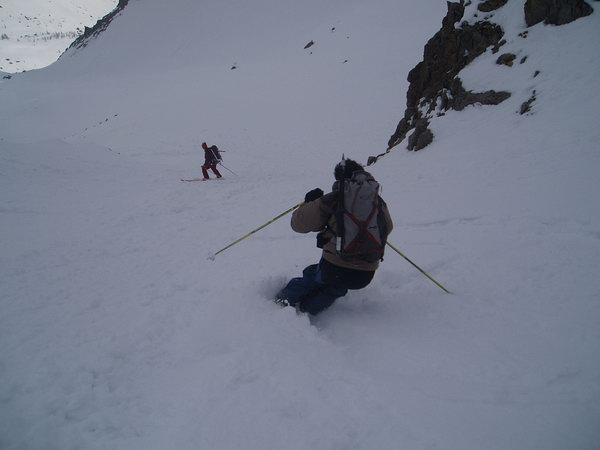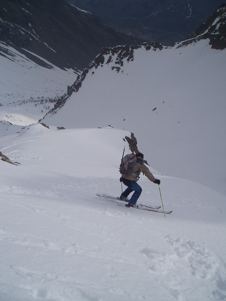 Petite rando de repli du fait d'une météo moyenne (beaucoup de vent et sommets pris à partir de 2900 environ). Nous avons découvert ce couloir en pénétrant dans le vallon et nous nous sommes laissés tenter. Finalement ce n'était pas si mal : un peu de poudreuse dedans, quelques virages assez raides sur l'épaule de sortie, un peu de soleil. Une pensée aussi pour Antonin, Carole et toute leur famille.