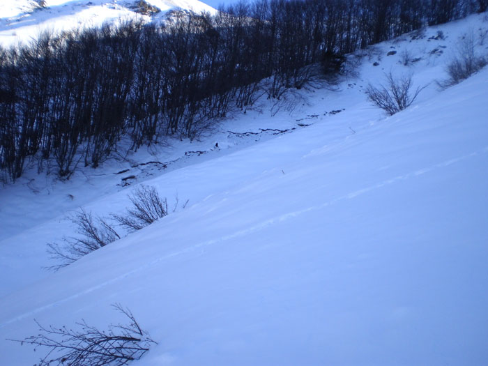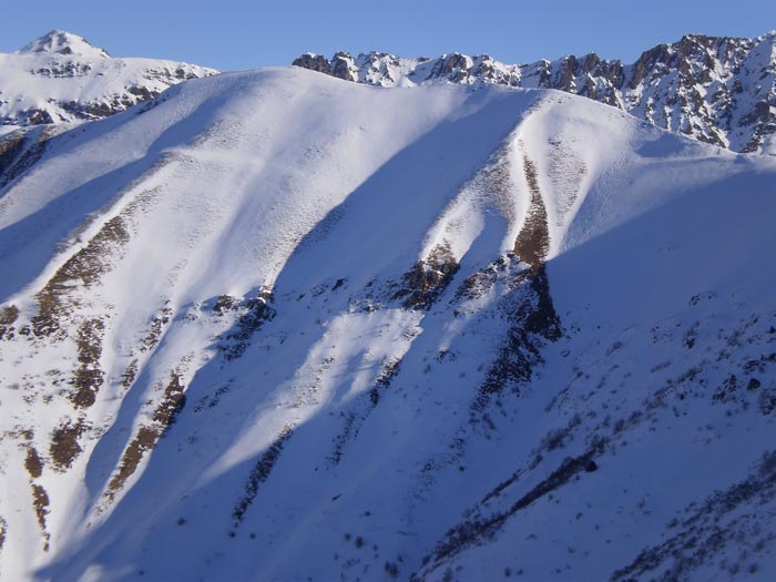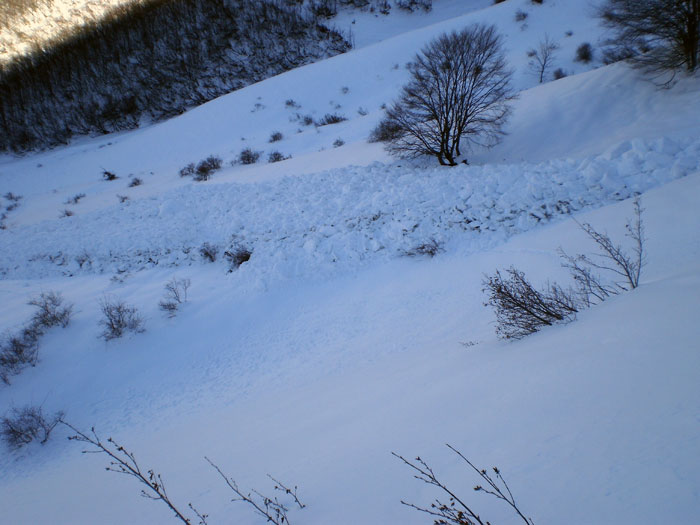 Une belle coulée de neige friable s'est décrochée vers 1650 sous les Planets et s'est étendue jusque vers 1500, où passe la trace de montée. Quand je suis passé à la montée, je ne l'ai pas vue, ce qui signifie, à moins que j'aie eu à ce moment-là la tête dans le guidon, qu'elle est partie entre 10h30 et midi, heure à laquelle je l'ai traversée pour remonter au Laton. La montée à roche Courbe par son arête est n'est pas la meilleure façon de procéder, surtout avec cette neige très froide sans aucune cohésion sur des pentes parfois raides et les multiples cavités formées par la végétation.