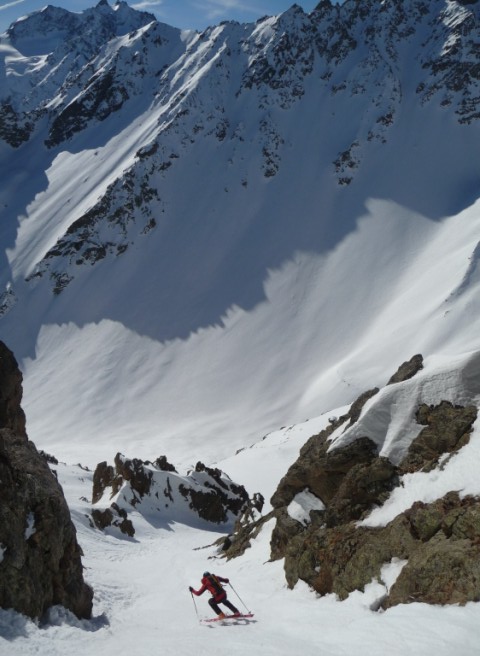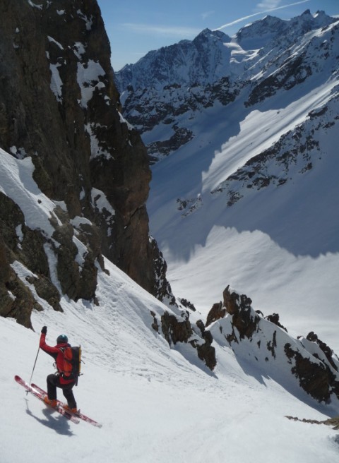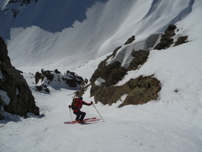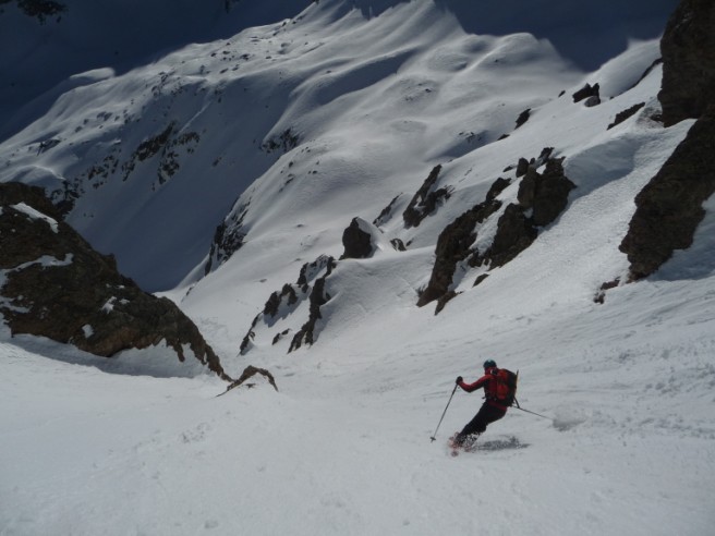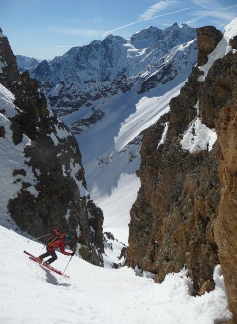 Partis pour profiter de la transfo, du soleil et pourquoi pas d'un peu de pente... d'abord merci au topo de Seb Constant et à J. Gingreau pour son passage récent. Le couloir diagonal est bien encaissé entre les rochers somptueux rouge, voit le soleil vers 10h30, décaille assez vite, en bonne conditions, bon remplissage et pas de goulotte. Il fait 300m grand max, on aurait plutôt vu 5.1 (?). Pour le Pic Est de Combeynot, on a pris le premier couloir (rive gauche du topo) pour monter tout en peau. Arrêt au col sous le sommet. Pris un cheminement direct à la descente. un passage blé vers 2950/2900 orienté SE, ça part sous les skis, mais pas trop épais. Bel itinéraire esthétique dans les tours et sauvage. Du monde à la tête du Vallon et Jumelles Sud.