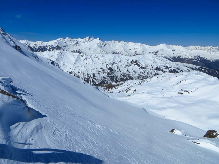 La face purgée, le groupe peut suivre (non sans serrer les fesses pour les serre-fils avec un départ secondaire au passage du 7ème), et la reste de la boucle est sans encombres, avec une bonne neige dans notre incursion sur le territoire d'Orelle.
