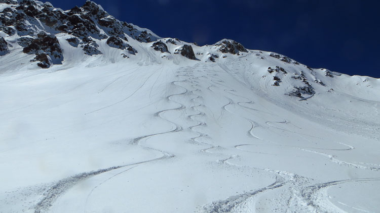 Malgré les réticences du groupe à basculer dans ce versant nord-est (alléchant vu de profil mais bien chargé et ouvert vu d'en haut), notre démineur/motivé du jour nous sort un coup de roulette mauriennaise, et se lance dans le versant prudemment mais surement.. Au bout de 50 m et la partie plus raide avalée, une traversée à droite et c'est toute le bas de la face qui part, laissant notre intrépide du jour au niveau de la cassure sans bobos..