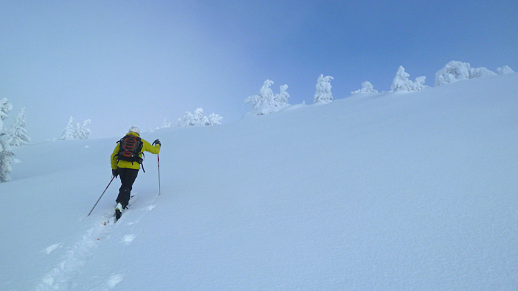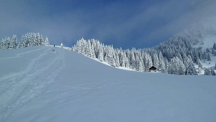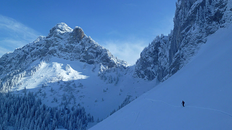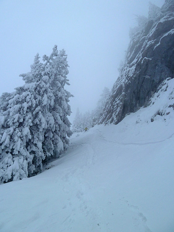 Le repérage automnal est payant pour trouver l'entrée du pas de la Truie (dans le brouillard et à la tombée de la nuit ça sert), la tâche ayant été également facilitée par une trace de montée d'un skieur apparemment parti pour un tour de sous-Dine.