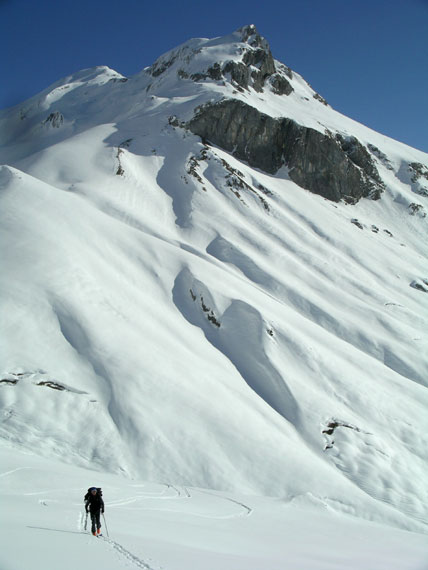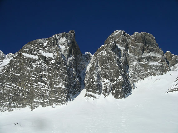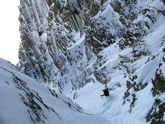 On visait de la poudreuse dans le couloir, on a été servi ; Sous le couloir aussi du à la chute de neige de lundi. Les faces Est et Sud sont en cours d'humidification, elles vont commencer à crouter. Pas la peine de se presser, le couloir voit le soleil jusqu'à 10h. Sinon approche au soleil (apprécié avec ces t° négatives), couloir raide et en poudre, vu magnifique et pas un chat dans le vallon, du bonheur à l'état pur...