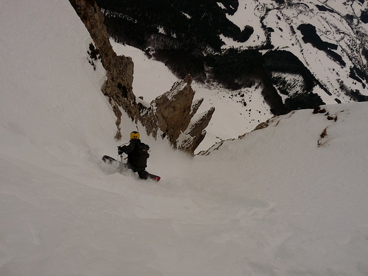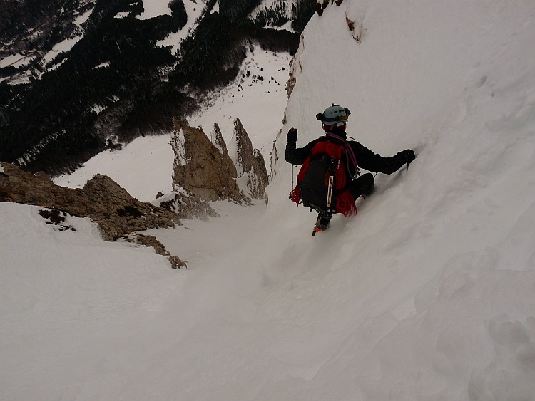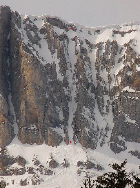 Rencontre inopinée avec Mathieu hier lors d'une session de luge au Baconnet, pile en face. On se rentre vite compte qu'on lorgne sur la même ligne. Le RDV est pris pour le lendemain même, histoire de profiter de l'excellent enneigement 2013. Nous avions buté dans ce couloir l'an dernier avec XAG, ne réussissant pas à combiner excellent remplissage et nivo soft. Les barres sous le couloir sont des nids à plaques. Ruptures visibles régulièrement depuis Gresse. Cette année c'est top, nivo saine et grosse neige. Le ressaut est passé en rappel pour Xavier et moi (désescalade tendue sinon) mais Mathieu l'a sauté. Fallait vraiment en vouloir car entre l'approche et la réception qui se font dans du 50° et l'étroitesse du bazar, il y avait de quoi en dissuader plus d'un ! Dont nous les premiers d'ailleurs.
