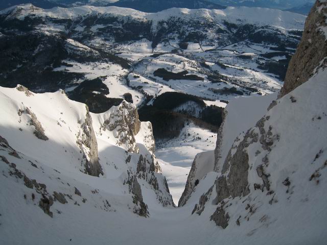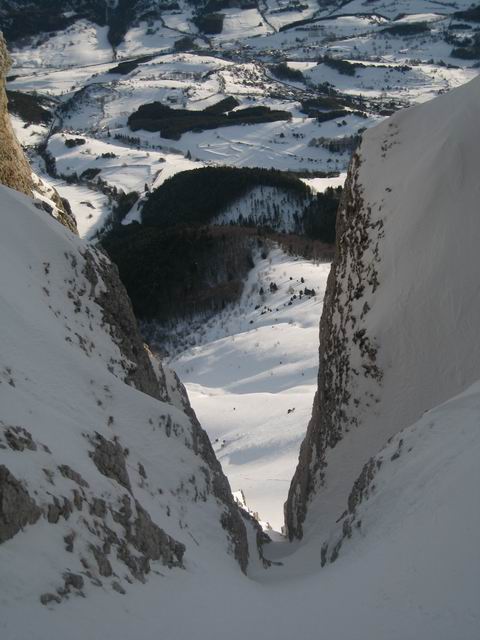 Superbe! Parti pour un simple A/R au pas de Berrièves, descente à vue de ce splendide couloir repéré à la sortie de la forêt. Orienté plus Est que ces voisins plus au nord, il est en revanche ultra encaissé. Magnifique ambiance tout au long, avec des parties bordées de grandes dalles verticales. Quelques acrobaties pour descendre les 2 ressauts du bas, qui doivent s'enneiger plus tard en saison, mais ce couloir doit vite se goulotter