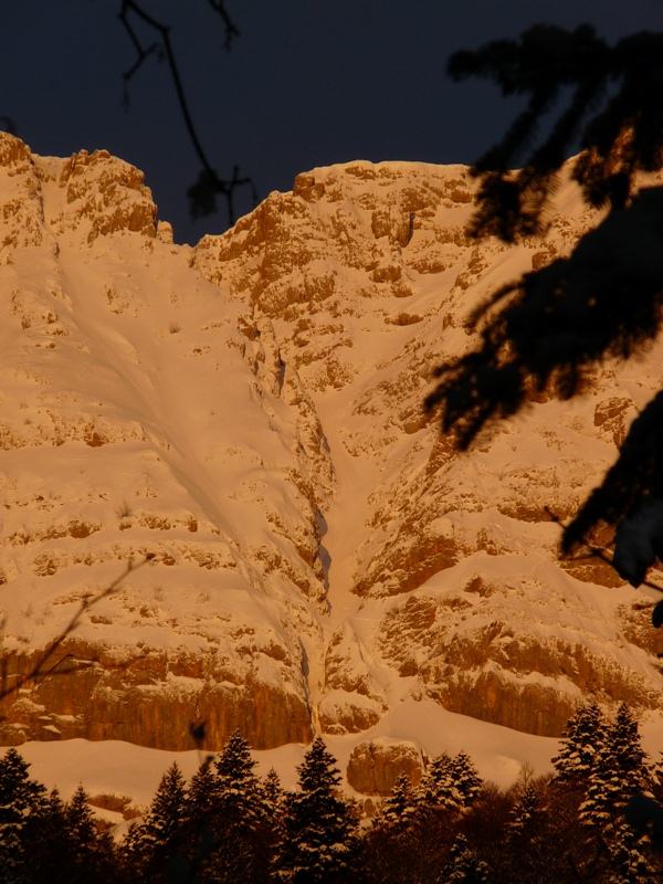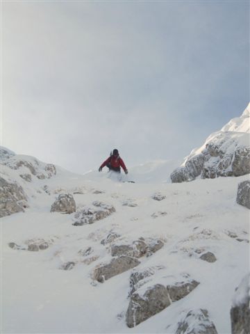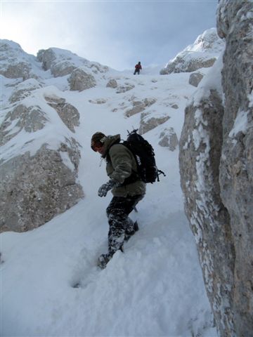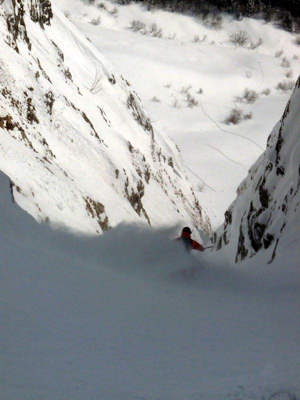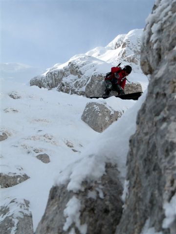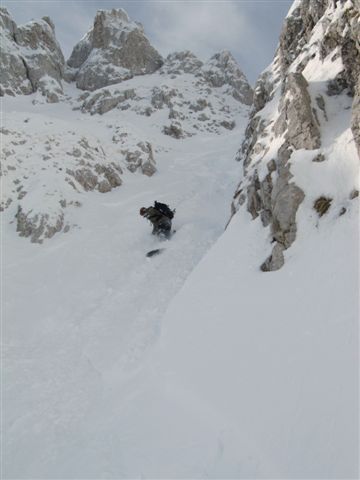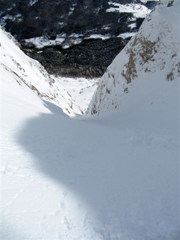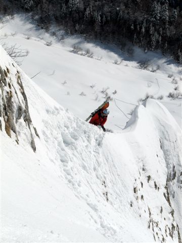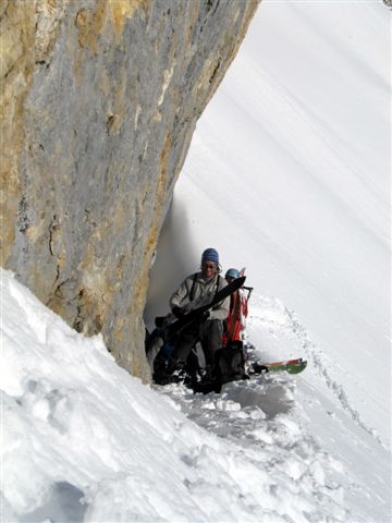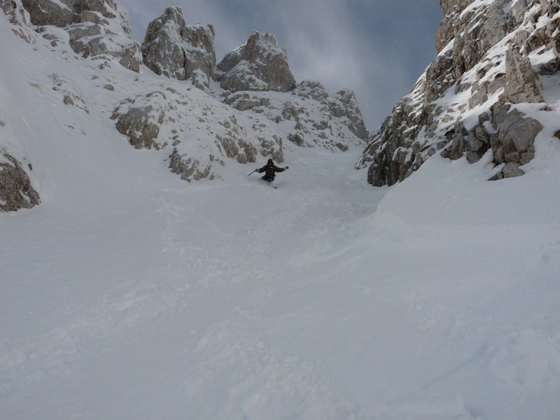 Couloir fait en AR. La vire d'accès est vraiment très raide et peut-être un peu accrobatique à descendre (et à monter aussi en neige froide). Dans le couloir lui même c'est un peu moins raide et globalement plus large que dans son voisin méridional. Le haut est plutôt mieux enneigé que l'an dernier à la même époque. On entre facilement et sans ''bricoler'' par une contre-pente nord très bien enneigée. 10 m plus bas un petit tout droit sur un mixte neige/herbe permet de prendre pied dans le couloir et éviter ainsi tous les rochers dans l'axe de la sortie.