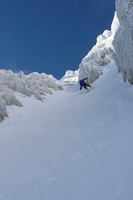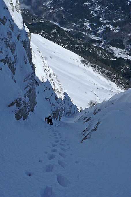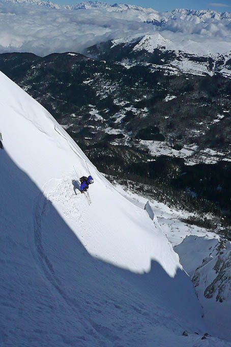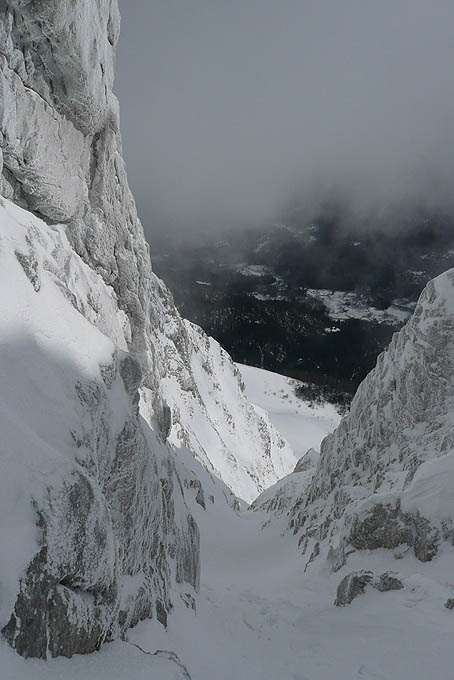 Un bon repérage nous a permis de trouver l'entrée du premier couloir en plein brouillard. Au départ depuis le sommet, le ciel se dégage d'un coup comme par miracle. Ces deux couloirs sont probablement à mettre dans le top five de la barrière est du Vercors.